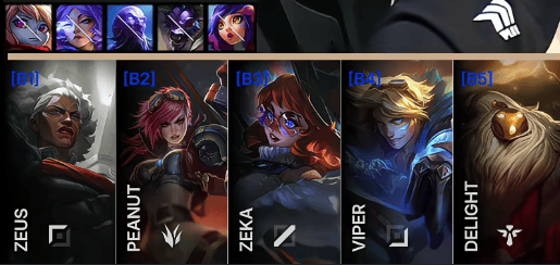 HLE选用:Zeus狼母;Peanut蔚;Zeka阿萝拉;Viper伊泽瑞尔;Delight巴德