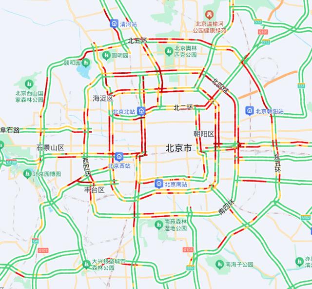 晚高峰期间,通勤、休闲、聚会出行叠加,城区东西部环路北向南、北部环路东向西部分路段,万泉河路、西直门北大街、丰体南路等联络线出城方向部分路段,京藏、京开、京港澳、京通快速等高速公路出京方向部分路段车流量大。