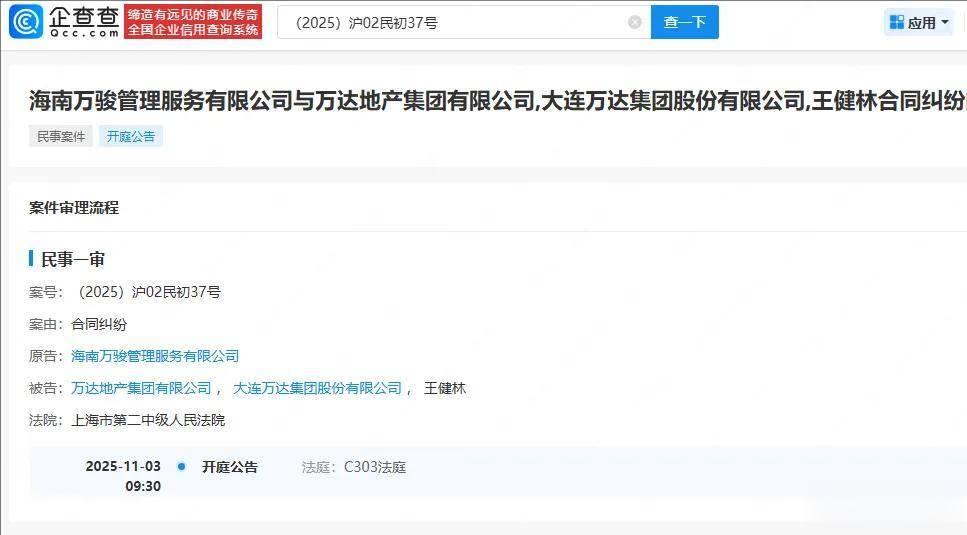 企查查APP公开的开庭信息显示,近日,大连万达集团股份有限公司、万达地产集团有限公司及王健林本人,已被海南万骏管理服务有限公司以合同纠纷为由起诉,案件定于2025年11月3日在上海市第二中级人民法院开庭审理。
