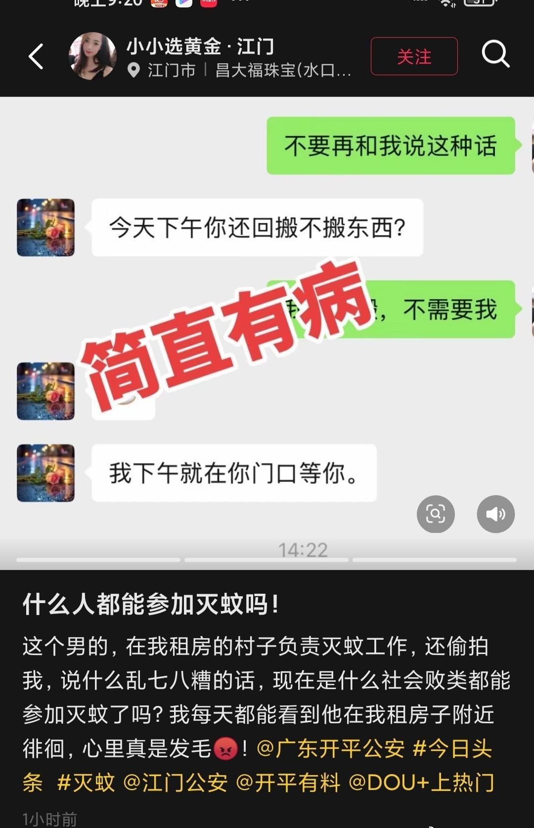 10月16日,网友反映:广东江门,男子是灭蚊人员,对其拍照和言语骚扰。