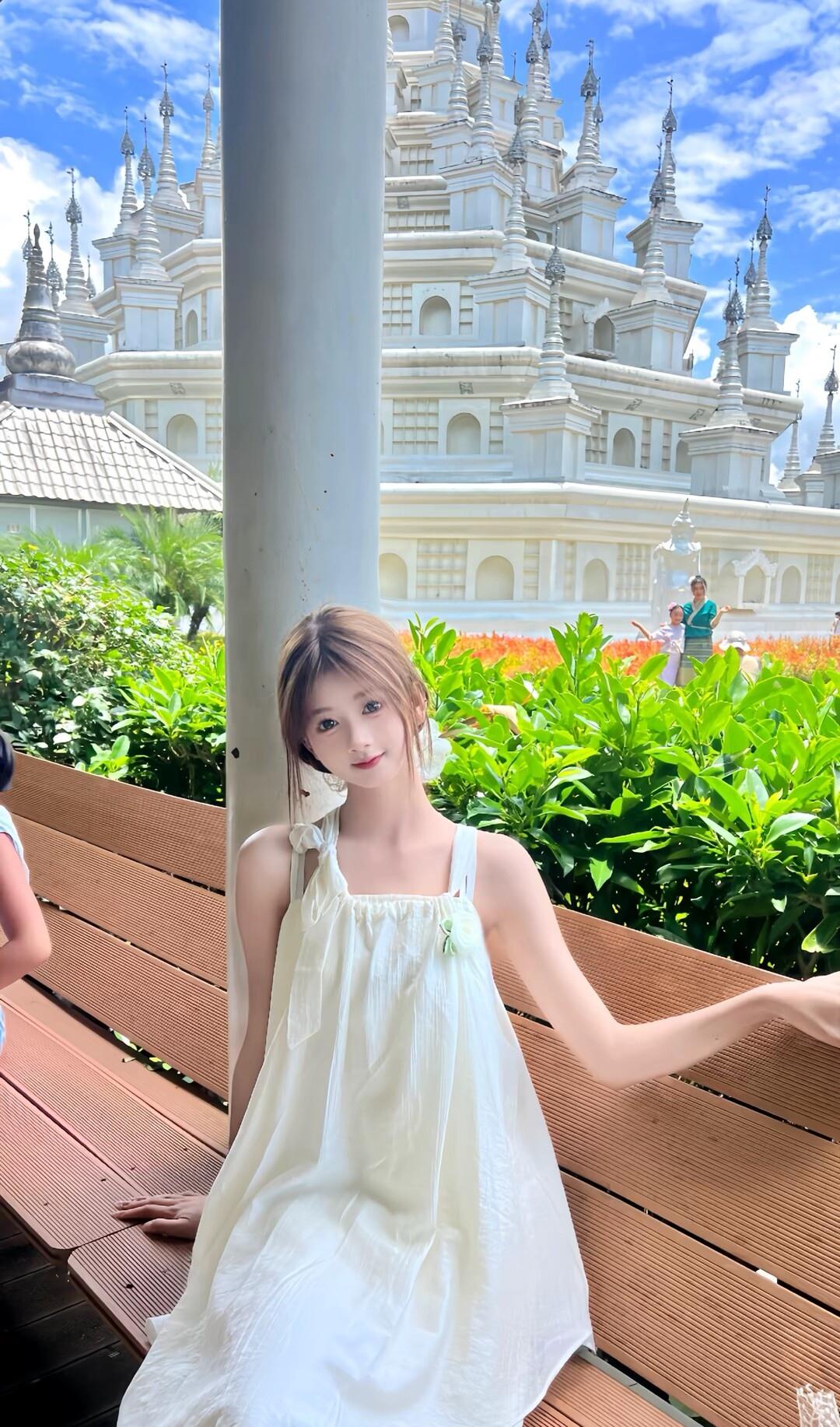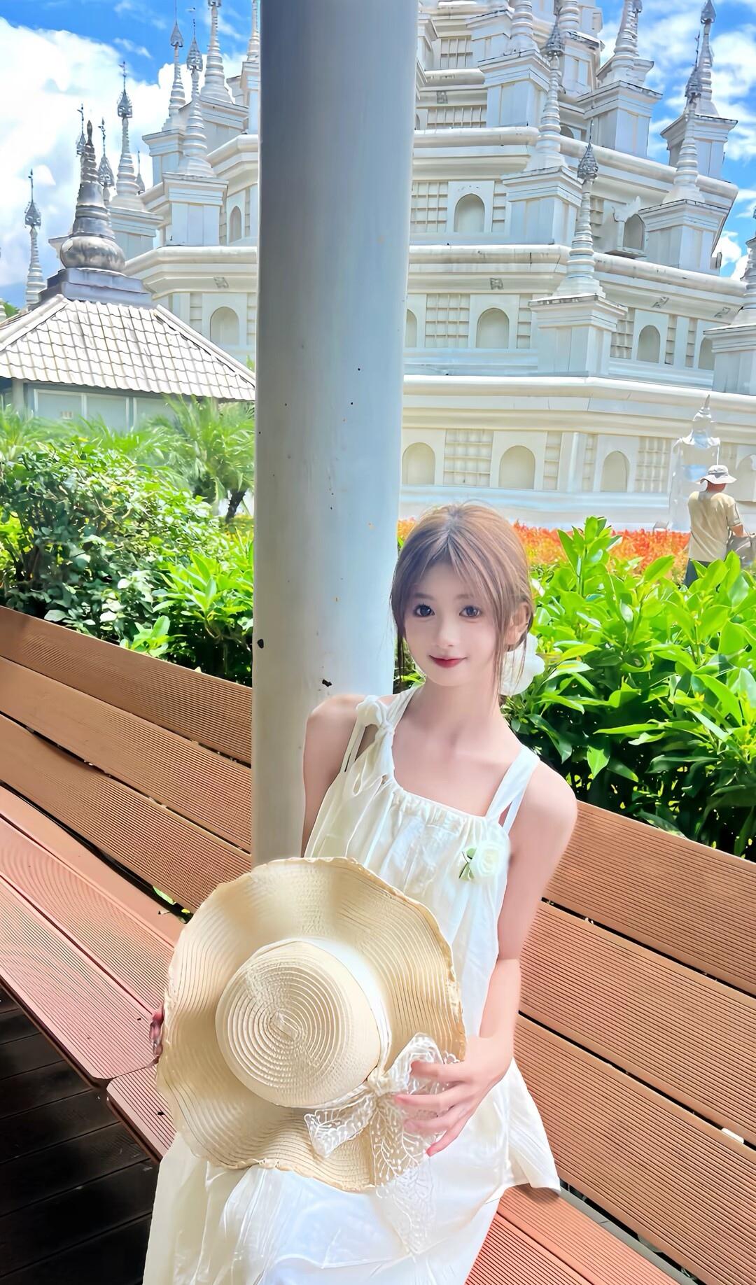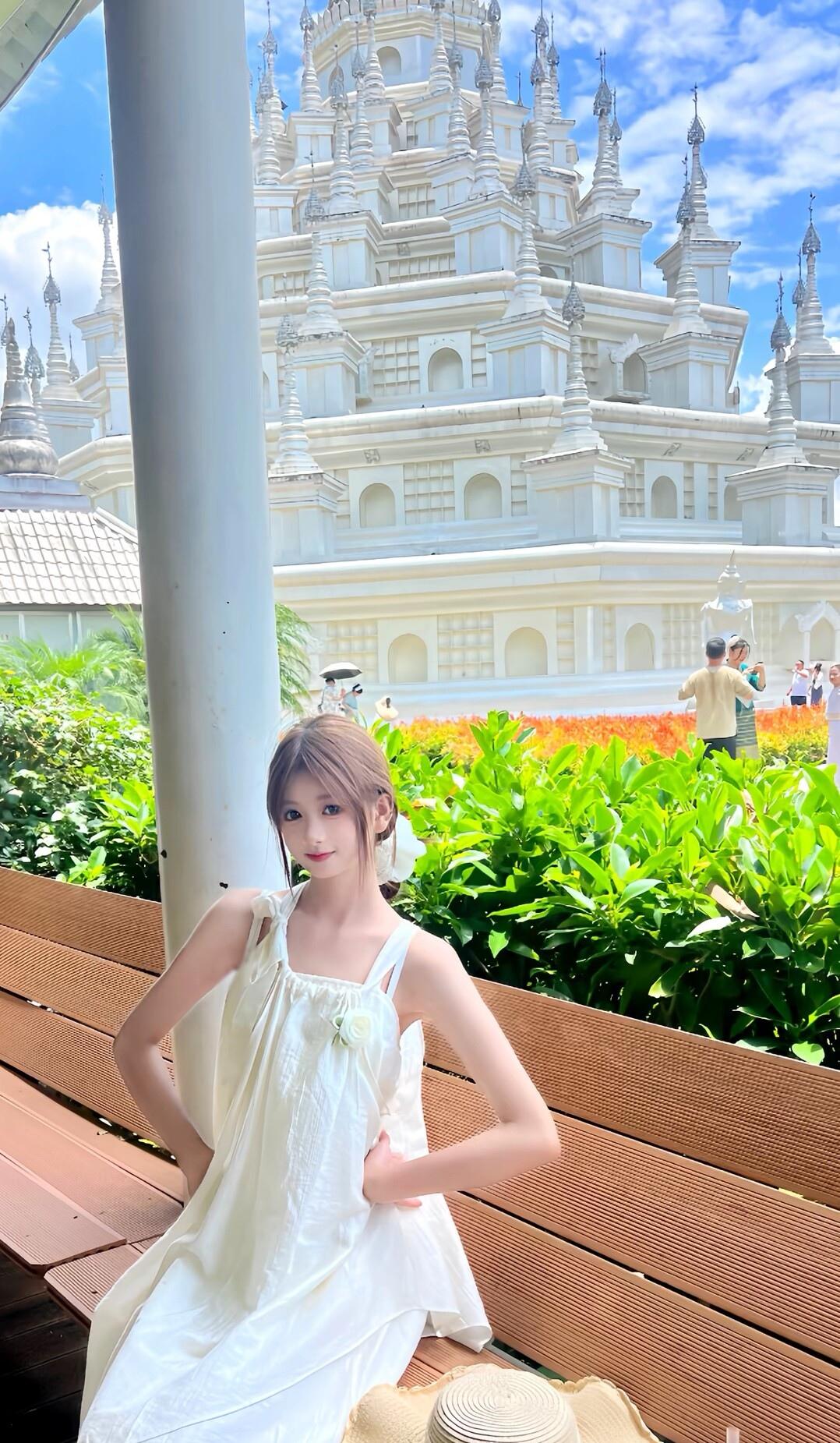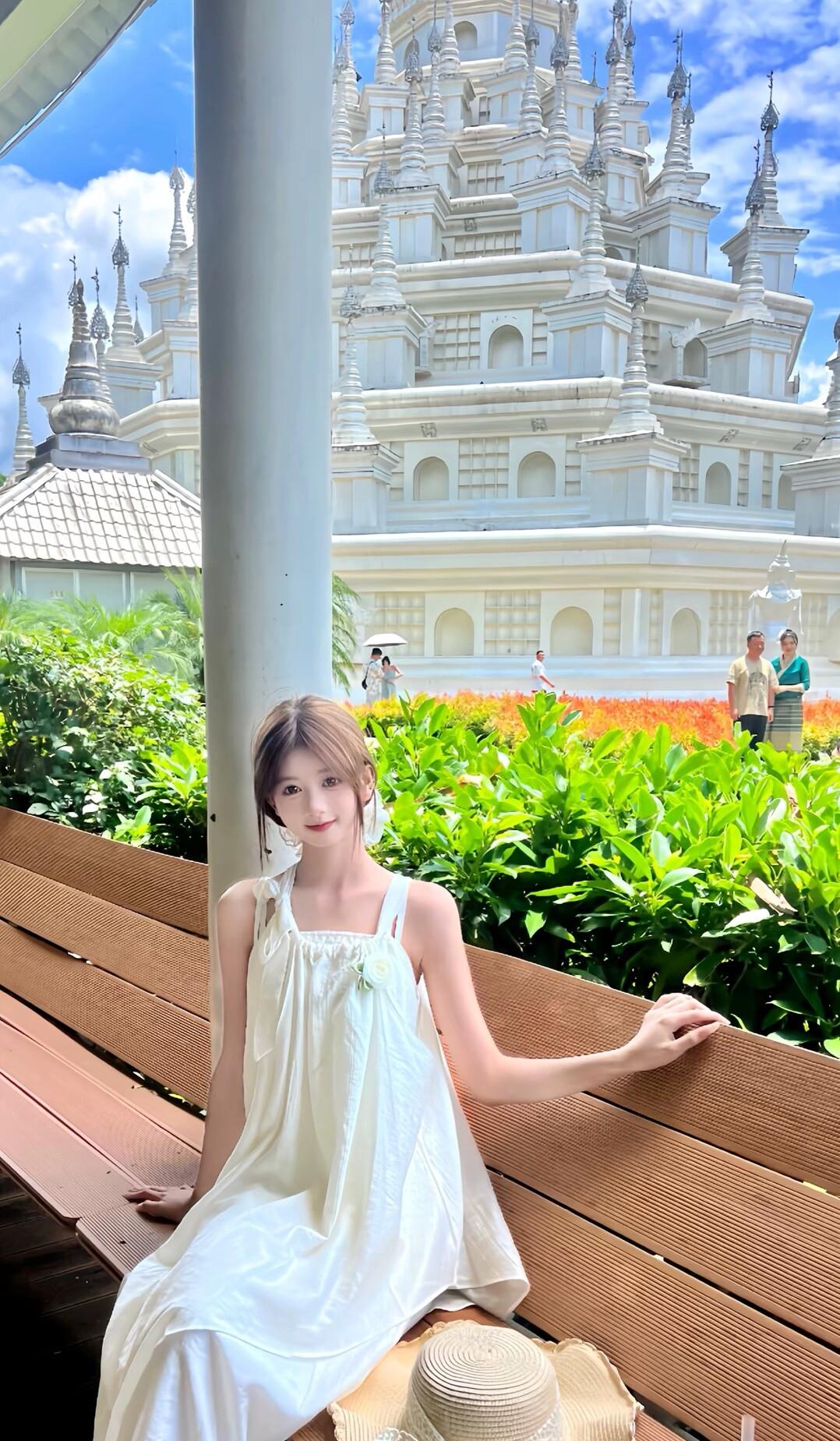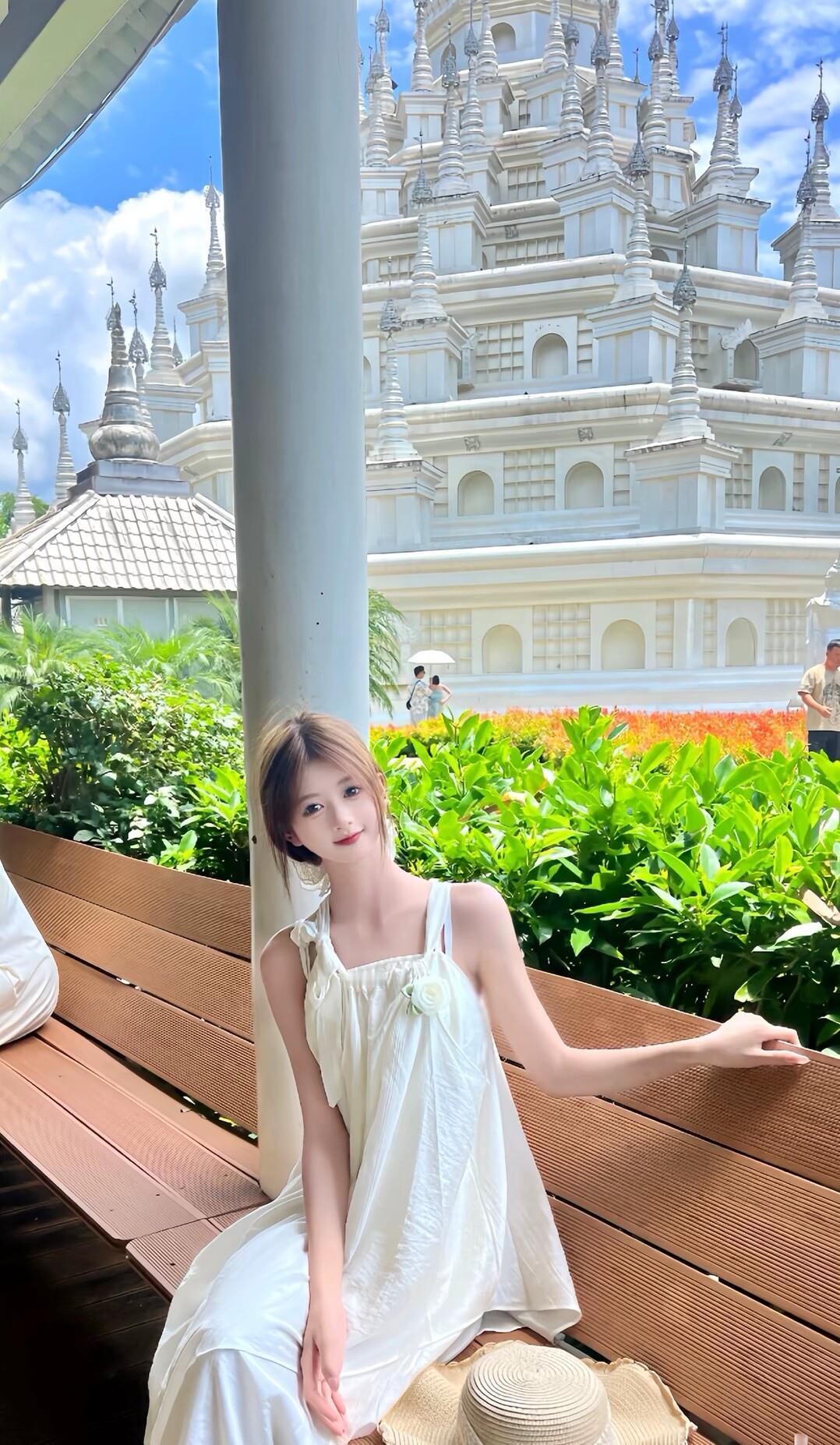 阳光明媚的午后,白色连衣裙少女在寺庙前悠然自得。