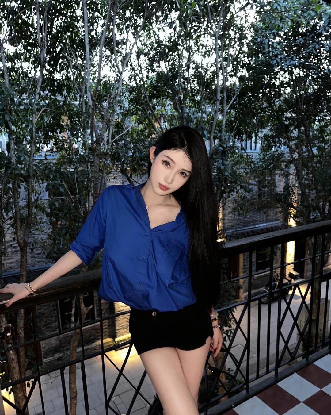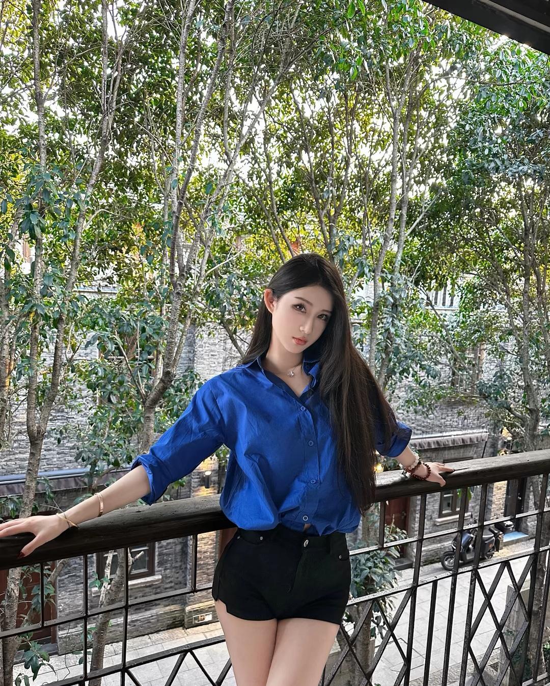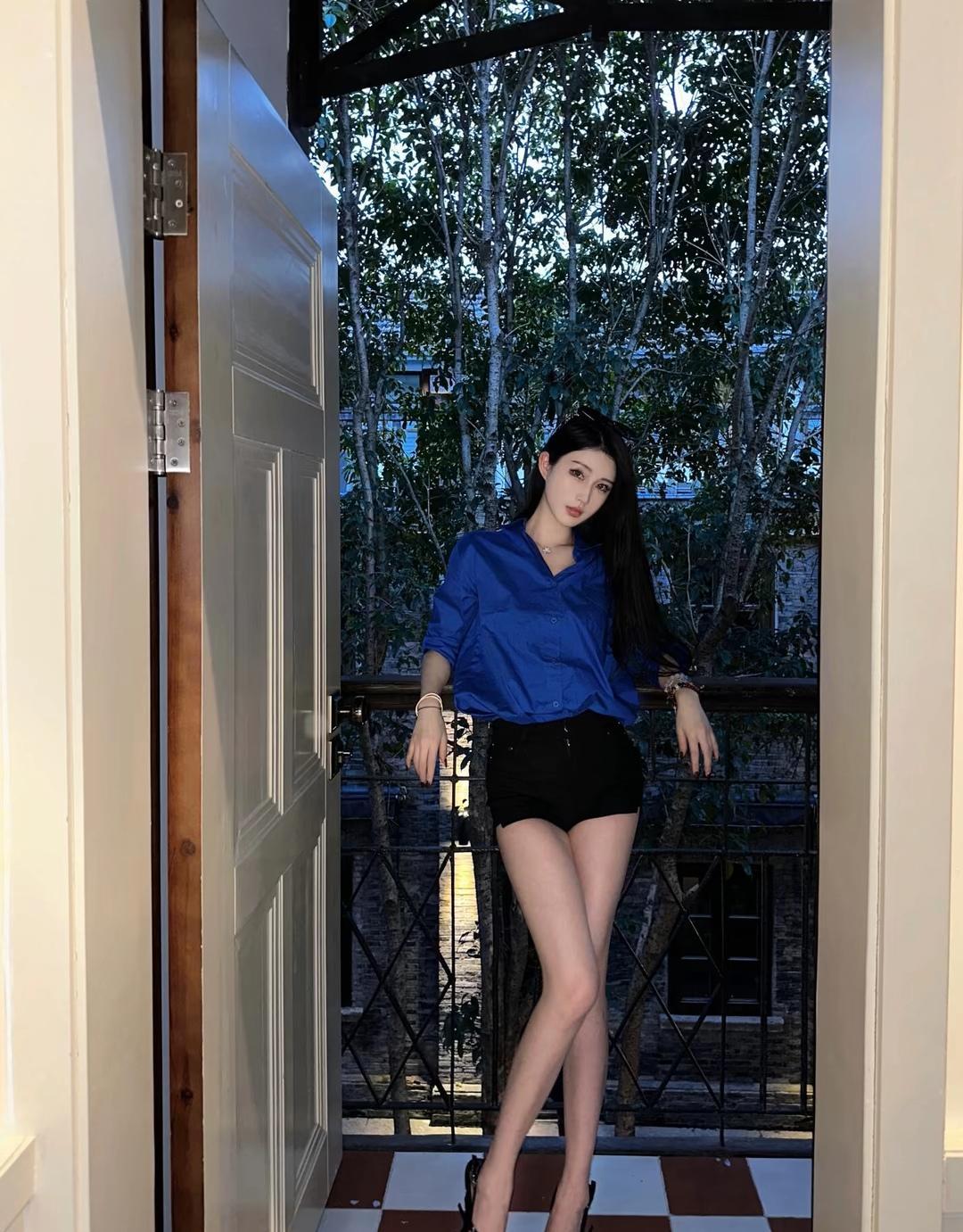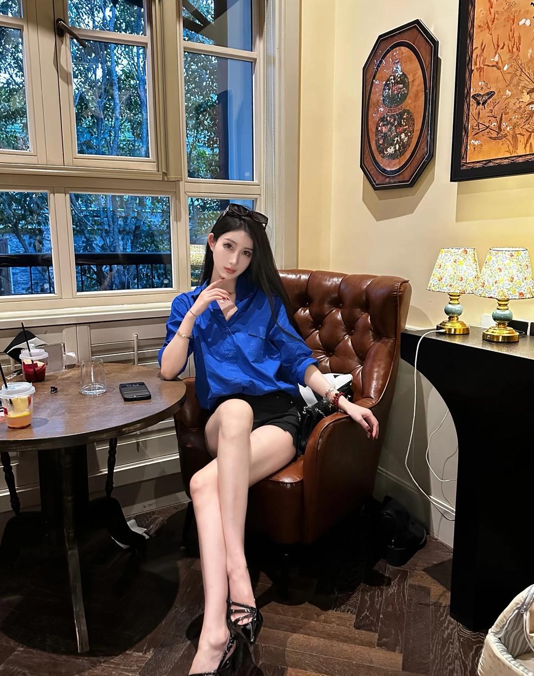 都市女孩的时尚穿搭,蓝衬衫+黑短裤,优雅又帅气!