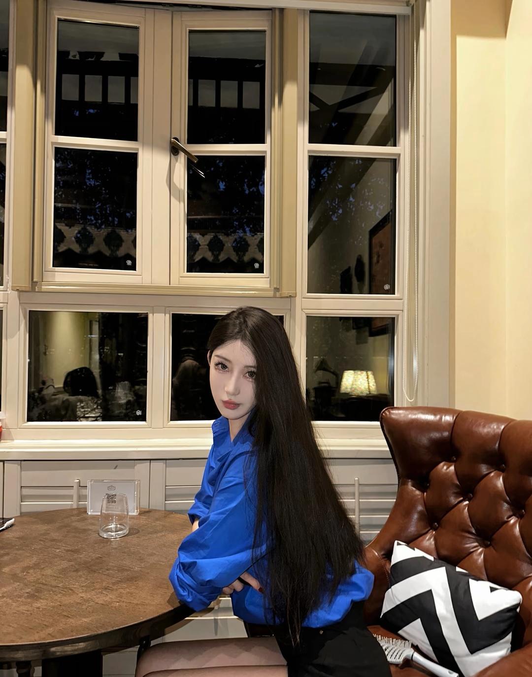 哇,吴越这样穿好美呀!黑色皮衣搭配蓝色衬衫,知性又帅气!皮衣是套头的那种,把