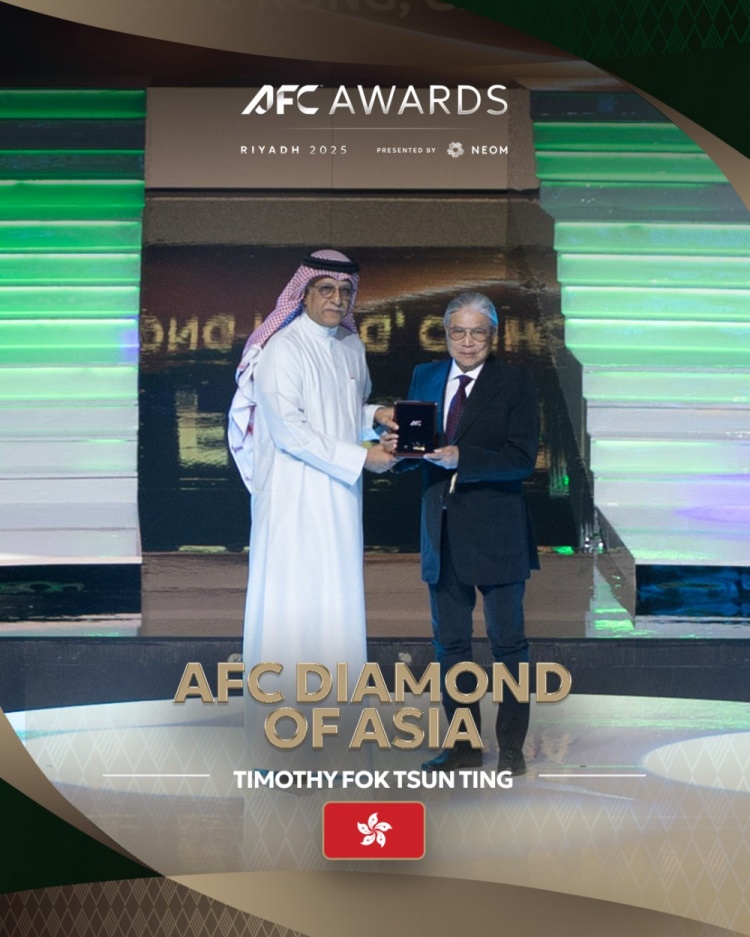 在2025年亚足联颁奖典礼上,中国香港的霍震霆获亚洲之钻奖。