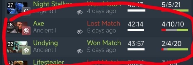 他第一局用的尸王,最终KDA为2/4/20,第二局的KDA为斧王4/10/10
