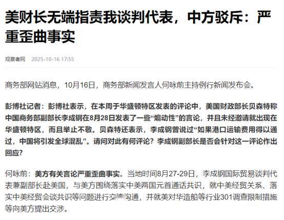 15日,贝森特在记者会上抱怨,中方副部长李成钢8月访美时就已警告他:若敢收港口费