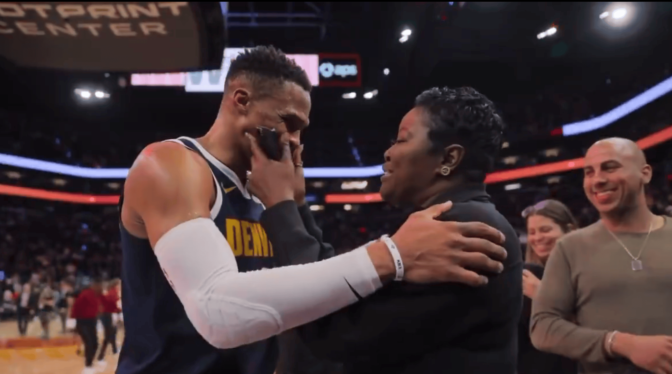 凯文-杜兰特的母亲旺达-杜兰特在赛后看到威斯布鲁克后,用手戳了戳他的脸颊,并说道: