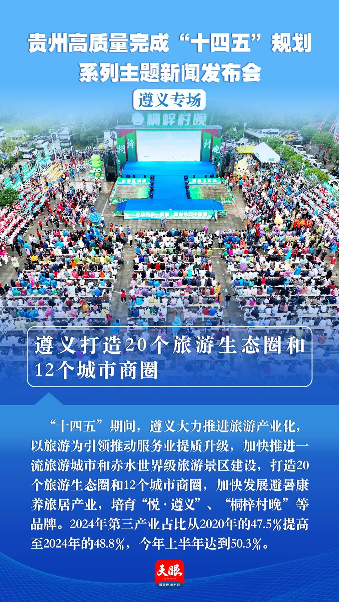 10月15日,记者从“贵州高质量完成‘十四五’规划”系列主题新闻发布会遵义专场上获悉,“十四五”期间,遵义大力推进旅游产业化,以旅游为引领推动服务业提质升级,加快推进一流旅游城市和赤水世界级旅游景区建设,打造20个旅游生态圈和12个城市商圈,加快发展避暑康养旅居产业,培育“悦·遵义”“桐梓村晚”等品牌。2024年第三产业占比从2020年的47.5%提高至2024年的48.8%,今年上半年达到50.3%。