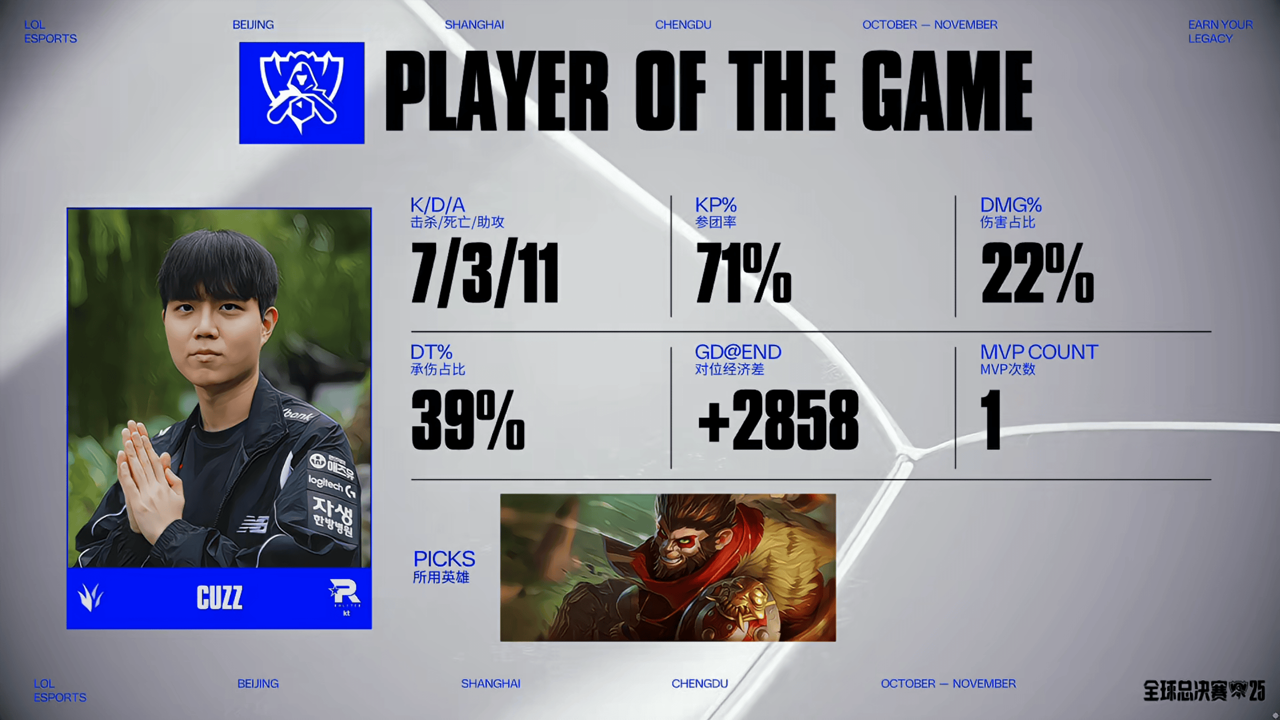 Cuzz猴子打出7/3/11战绩,拿下KT对阵TES第一局MVP