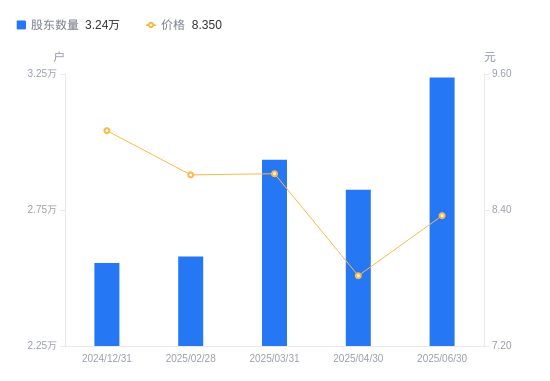 日期A股户数(户)流通A股户均持股数(股)户均持股市值(万元)2025-09-302637310529.089.522025-06-30323758442.127.052025-04-30282439668.787.562025-03-31293439306.338.122025-02-282578810589.259.222024-12-312554710689.149.732024-09-30262179926.049.332024-06-30269559675.218.902024-03-31272216480.615.682024-02-29265762298.632.19