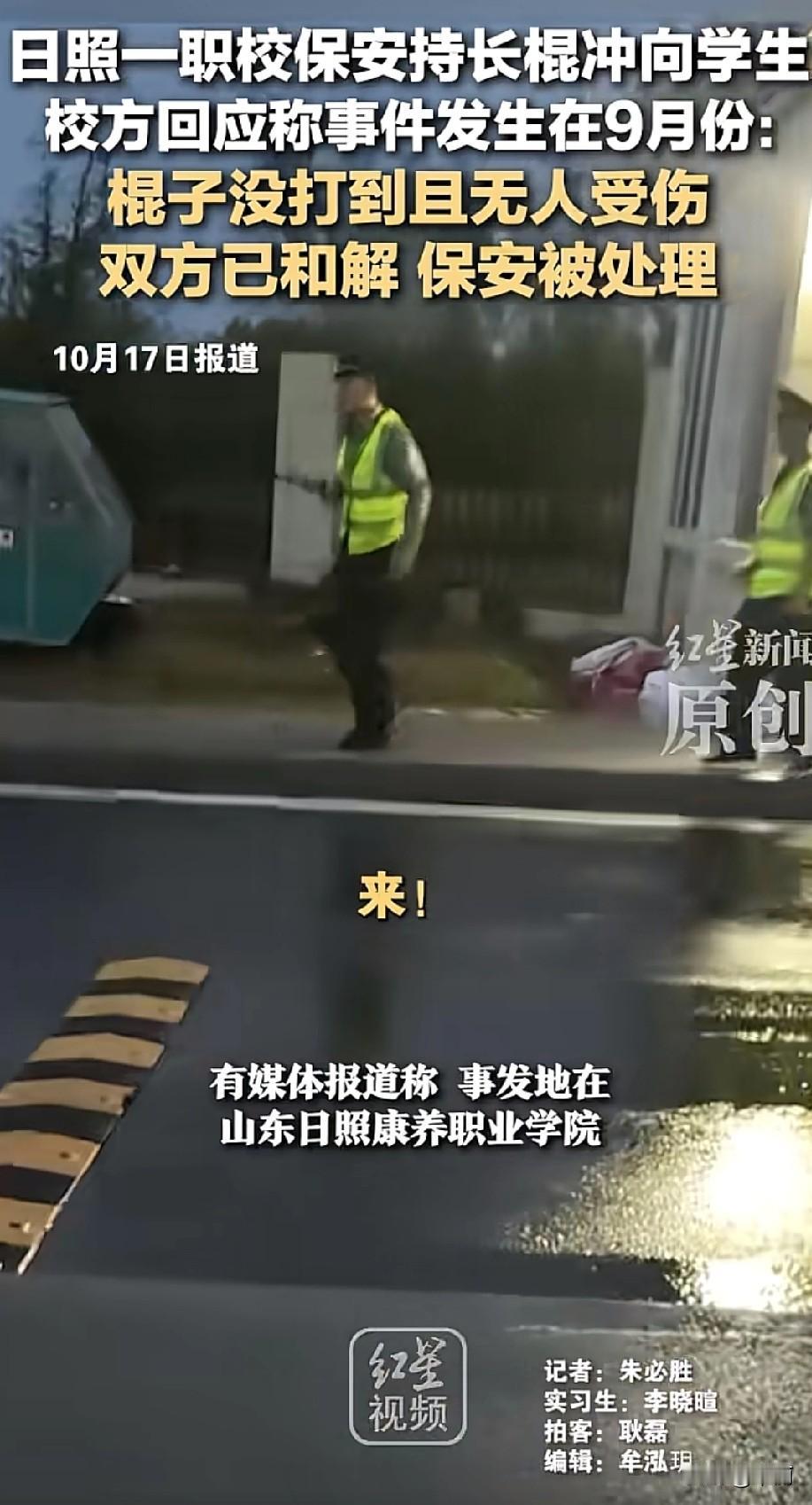 山东日照康养职业学院有段视频挺火。穿保安服的男子不顾同事阻拦,夺过长棍冲向一男一女,喊着“来啊”挥棍,对方边退边喊“保安打人”,还有人报警。 知情者说9月16日事发,女生是该校学生,帮同学代购校外物品,保安不让进引发口角冲突,男子是校外人员。 现在涉事保安已经被开除,当地派出所9月17日调解完了,事情算妥善处理。 保安管校园秩序没错,但持棍冲人太冲动。维护规则得有边界,不能动粗。学校管理也得更灵活,偏远地区学生买东西不方便,是不是能想点折中办法? 网友其实也关心,安保是护着学生还是吓着学生,管理有规矩更得有温度才行。