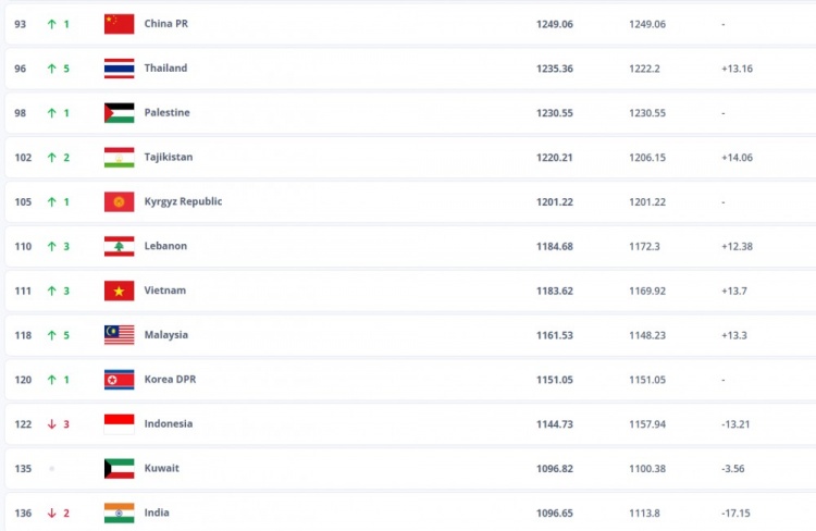 直播吧10月17日讯IFA更新最新一期国家队排名,亚足联国家队方面,国足积分不变,但排名从世界第94位升至世界第93位,亚洲排名则仍是第14位。