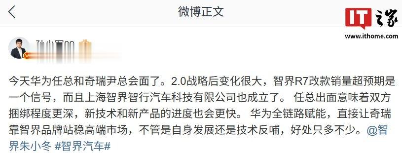 [消息称华为任正非和奇瑞尹同跃会面意味着双方捆绑程度更深,新技术/产品进度会更快]博主@孙少军09今日发文解读了华为任总和奇瑞尹总的会面,他称任总出面意味着双方捆绑程度更深,新技术和新产品的进度也会更快。智界2.0战略后变化很大,智界R7改款销量超预期是一个信号,而且上海智界……