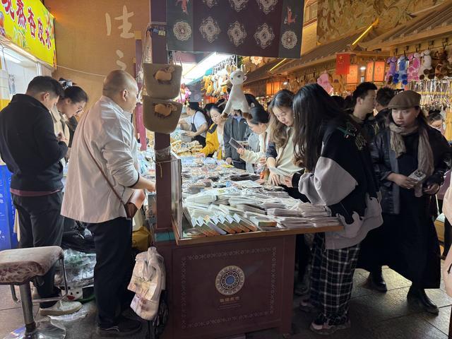 在“敦煌集”集市中,两侧皆是敦煌特色食品、文创摊铺。敦煌沙州夜市负责人窦永学介绍,各类商家入驻集市,展示特色产品,吸引了许多游客驻足。