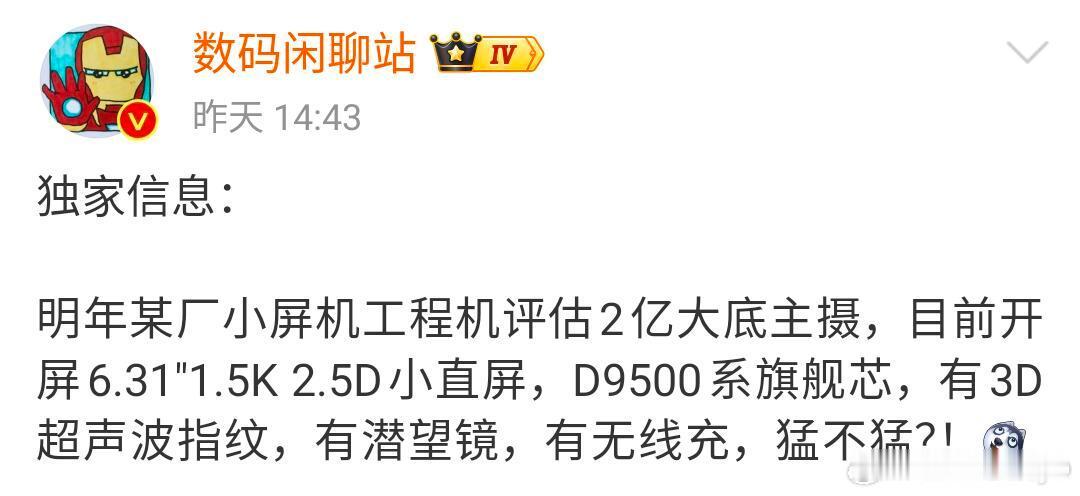 10月13日,数码闲聊站独家爆料称:“明年某厂小屏机工程机评估2亿大底主摄,目前开屏6.31英寸1.5K分辨率2.5D小直屏,D9500系旗舰芯片,有3D超声波指纹识别,有潜望镜,有无线充,猛不猛?”看站哥的“表情包”暗示,这款新机就是荣耀Magic8 mini!