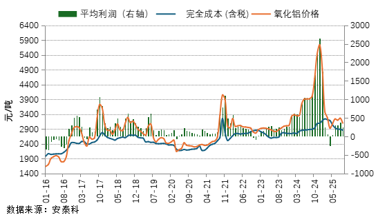 根据安泰科测算,2025年9月国内氧化铝加权平均完全成本(含税)为2857元/吨,环比下降32元/吨,同比下降31元/吨。同期,氧化铝现货价格重心下降至3098元/吨,环比下降165元或5.1%。9月氧化铝行业平均利润为241元/吨,较上月有所下降。9月国内氧化铝开工产能9668万吨/年,开工率84.9%,环比上升1.8个百分点。