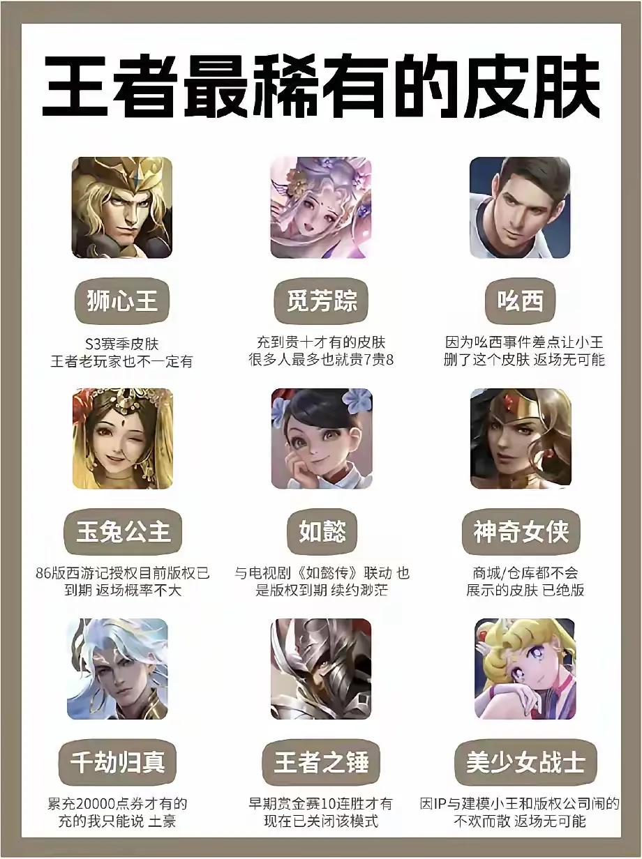 王者最稀有皮肤一览,你有几款? 亚瑟的狮心王是多少人的遗憾,在艾琳这个英雄重做开放获取后,只有真正的老玩家才有这款皮肤,虽然品质等级不高,却有非凡的纪念意义。 艾琳的觅芳踪是V10限定,获取难度比荣耀典藏还高。