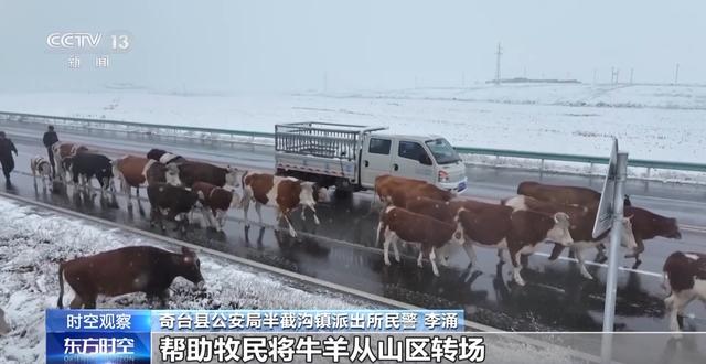 入秋后新疆奇台县部分山区气温偏低,此次降雪进一步加大转场难度。奇台县半截沟镇涉及转场牧民多、牛羊规模大,派出所民警第一时间制定方案,沿路线巡逻值守,清理积雪、排除隐患,还为牧民提供物资补给和路线指引。