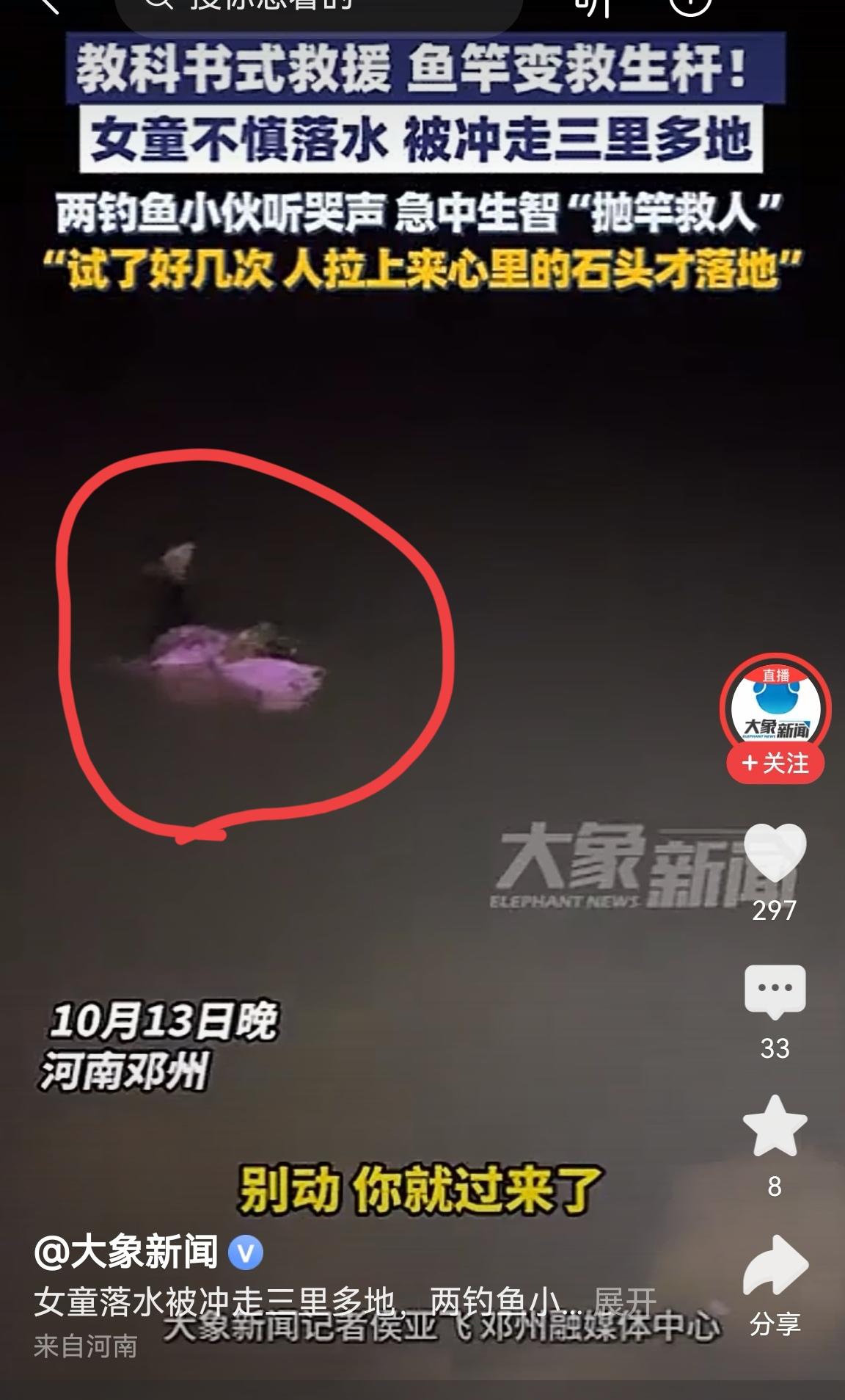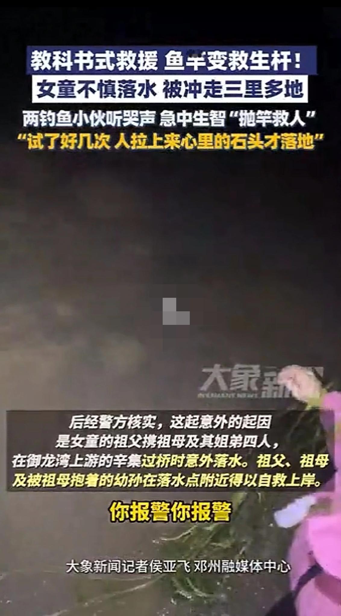 别误会, 这俩钓鱼佬不是犯了错,而是救了人。 被救三岁女童一句话全网感动了。 一家四口过桥时意外落水,三岁女童被冲到下游三公里外。 黑夜里两个不会游泳的钓鱼佬,听到河里隐隐约约的哭声。 用抛鱼竿的办法,机智把漂浮的孩子救了上来。 三岁女宝宝,还没上岸就关心一起落水的爷爷奶奶弟弟的安危。 网友感叹,三岁女宝宝太牛了,落水后知道躺在水面,自己获救立刻冷静的告知落水的还有自己亲人。 最后一家四口均已平安。 网友辣评:别太禁止钓鱼,能钓的地方还是尽量放开吧,毕竟钓鱼佬能为我们社会安全做出特殊贡献。