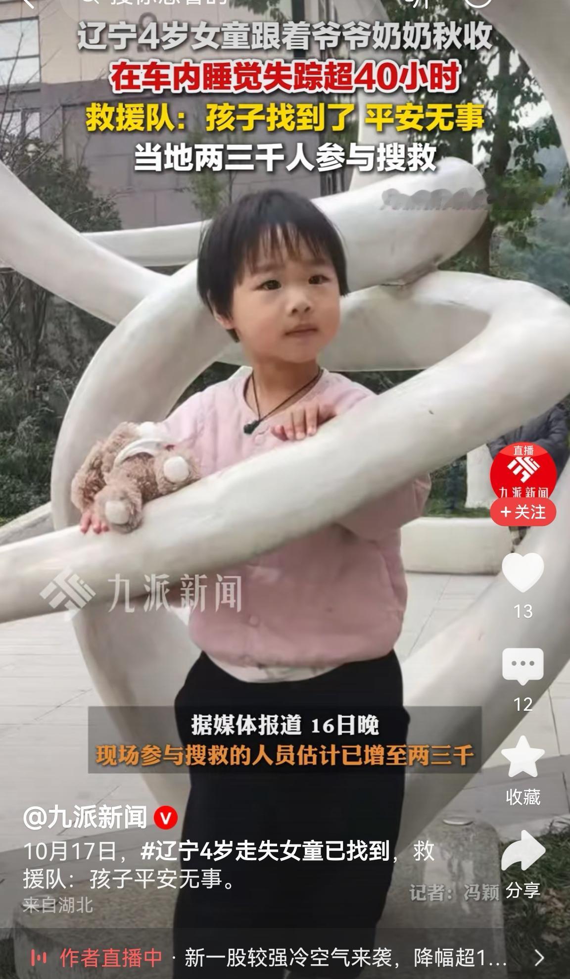 刚刚传来好消息, 辽宁失踪超过40小时的四岁小女孩,终于找到了。 不得不感慨东北人的热心,短短时间就有超过三千多志愿者参与搜索。 经过了40多个小时的不解努力,终于迎来了一个好消息。 孩子平安! 全网无数为之担心的网友们,也终于可以放心了。 大家的期盼也终于得到了最好的回应。