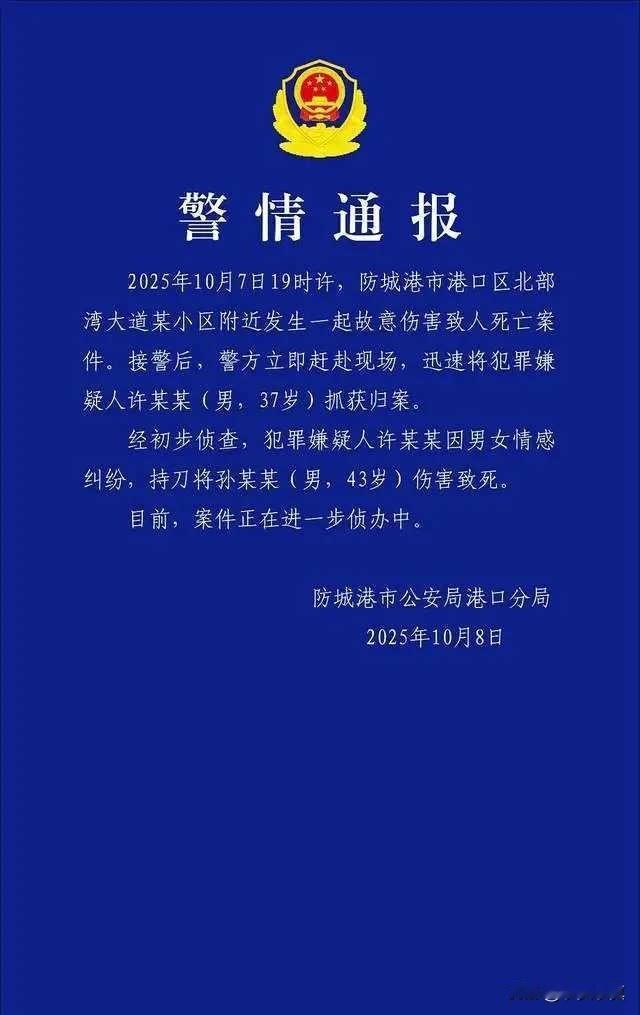 男子跟女友遛弯被杀,行凶者朋友圈晒行凶现场 10月7日晚间,防城港市港口区北部湾大道附近的居民区被暮色与警灯交织的凝重氛围笼罩,一起恶性凶杀案打破了夜晚的宁静。据周边群众回忆,案发后大家第一时间报警,当地警方与120急救车迅速奔赴现场,一场紧急处置随即展开。 从居民拍摄的现场视频中可见,小区门口停满警车,身着制服的民警与手持护盾的特警迅速布控,警戒线将核心区域严密围住,禁止无关人员靠近,警戒线外则聚集了不少围观市民。另一段视频显示,案发地周边分布着健身房、饭店等商户,原本热闹的生活场景,因这起案件蒙上阴影。 “就发生在阳光海岸三号门转盘附近,听说是一个男的把另一个男的杀了。”附近一位商户透露,120急救人员抵达后,很快与警方一同确认,受伤男子已当场身亡。随后官方通报揭开案件关键信息:37岁的许某某持刀行凶,致43岁的孙某某死亡,案发后许某某被警方迅速抓获。 关于案件起因,通报明确为“男女情感纠纷”,而当地网友的爆料则补充了更多细节。有网友称,案发时孙某某正与一名女子逛街,恰好被许某某撞见,后者随即施暴,女子侥幸逃脱;另有说法提到,许某某与前妻已离婚,其前妻后续与孙某某相恋,得知此事的许某某心生歹念,最终酿成悲剧。 更令人震惊的是,网传疑似许某某作案后发布的朋友圈截图。内容显示,他直白写下“我杀人了”,还配上大笑表情,下方附带案发现场的街边照片,甚至在评论区留言:“兄弟们,来生再见了,千万不要逼任何一个男人的底线。”不过,该朋友圈的真实性目前尚未得到官方证实。 一场情感纠葛演变成致命暴力,不仅夺走一条生命,更让两个家庭陷入深渊。目前案件仍在进一步调查中,而“朋友圈炫耀行凶”的传闻,也引发网友对极端情绪管控与法治意识的热议——无论矛盾如何,暴力都绝非解决方式,逾越法律红线,终将付出沉重代价。