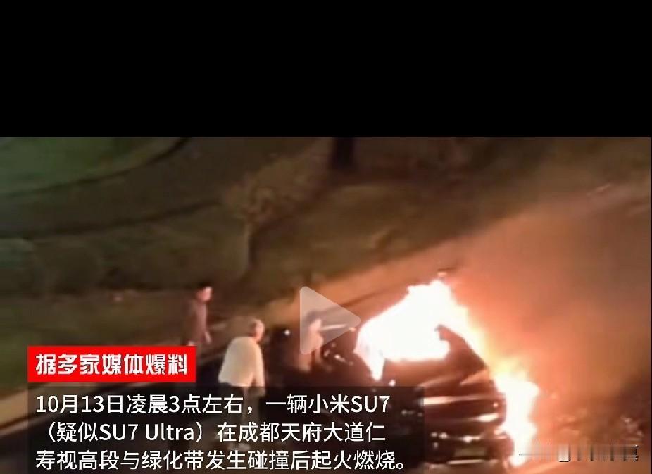 酒驾小米出车祸,司机当场死亡 2025年10月13日凌晨3时16分,成都天府大道仁寿视高段的夜色尚未褪去,一场突如其来的交通事故打破了道路的宁静。一辆小米SU7在此处上演了惊心动魄的失控瞬间,最终酿成悲剧。 据多名目击者的行车记录仪画面还原,事故发生前,这辆小米SU7已显异常——行驶中车身持续摇摆不定,毫无平稳可言。更有网友回忆,此前在路口等待红绿灯时,曾清晰听到该车驾驶室内传来驾驶员的大声吼叫,当时的异常状态未料竟成事故前兆。 短暂的异常后,危险骤然降临。小米SU7突然超速失控,先是狠狠撞向道路中央的绿化带,巨大的冲击力让车辆瞬间改变方向,随即翻滚着冲入对向车道,车身落地的瞬间便燃起熊熊大火。另一车主的行车记录仪则捕捉到更揪心的画面:碰撞前,该车从右侧车道飞速驶过,留下一道残影;碰撞发生后,火焰以惊人的速度吞噬车身,短短几秒内便成“火笼”。 “有人被困!快救人!”驾驶位上的人员无法脱身,焦急的呼喊让路过的车主和行人纷纷停下脚步。危急时刻,十余名路人自发加入救援队伍:有人徒手猛砸车窗,有人四处寻找工具撬门,还有人飞奔到附近商铺借来灭火器。混乱中,几位参与救援的路人手掌被破碎玻璃划伤,鲜血顺着指缝流下,却没人顾得上处理伤口。可无论众人如何努力,变形的车门始终无法打开,迅猛的火势更是不断逼近驾驶位,救援一次次被大火逼退,遗憾未能成功。 消防人员抵达现场后,立即展开专业救援。水枪喷出的水柱迅速压制住蔓延的火势,随后救援人员手持破拆工具,一点点切割变形的车身。经过半小时的紧张作业,现场火势终于被完全控制,交通秩序也逐步恢复。但令人痛心的是,当救援人员打开驾驶室时,驾驶员已不幸失去生命体征,这场凌晨的紧急救援,最终还是没能留住宝贵的生命。 目前,事故具体原因仍在进一步调查中。而凌晨时分,路人们不顾危险、徒手救援的身影,成为这场悲剧中最温暖的微光,也让人们在惋惜生命逝去的同时,看到了平凡人心中的善意与勇气。