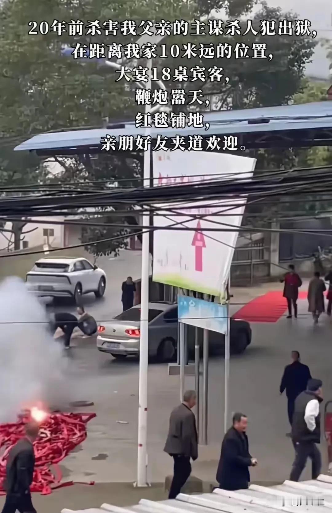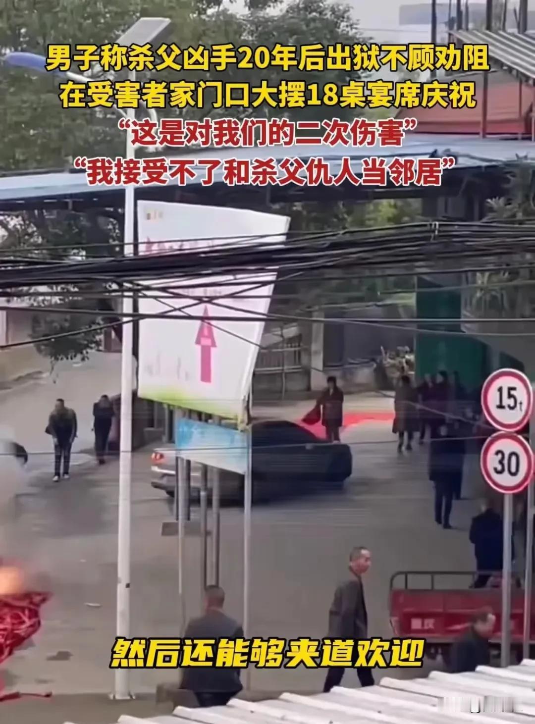 看完这件事,我似乎突然理解“张扣扣”了!万万没想到在这个年代居然还有这种无语的事情发生! 20年前杀父仇人出狱在受害者家对面大摆宴席,受害者一家无奈设灵堂反击,最后居然被网暴! 事情是这样的,四川绵阳青义镇一名男子在网络上发视频称:在他15岁那年,也就是20年前,当时他父亲因为一些琐事跟邻居发生了争吵。 这场吵架不欢而散,但邻居一家耿耿于怀,随后邻居就花钱请了三个人将他父亲残忍杀害了,邻居也因此被判刑20年。 在这20年时间里,因为父亲被杀害,男子一家人过得很艰难,但是母亲却一直在劝他放下仇恨,好好生活,他也一直牢记母亲的话。 今年11月15日,“杀父仇人”的邻居刑满释放回家了,邻居家跟男子家隔着一条马路,距离他家只有10米远。 为了迎接邻居出狱,邻居一家大摆宴席,18桌的亲戚好友聚在一起,热热闹闹的,不仅铺了红地毯,亲朋好友夹道欢迎,还放了很多烟花,当天可谓是喜气洋洋! 这一切让男子看了十分难受,他想到了自己的父亲,一想到因为邻居,他们家发生的天翻地覆的变化就难受,而且在他眼里,邻居家的行为还有刻意挑衅的味道。 气愤的男子就找到邻居家,希望他们可以停止这样的迎接活动,可惜换来的却是冷嘲热讽! 男子打算反击,就在家门口摆上了灵堂,拉上白色祭奠横幅。 这样一来,马路两边的画风就变得很奇怪了,男子家摆灵堂,邻居家亲朋好友举杯欢庆。 随后有人报了警,邻居家的宴席才被叫停,刚出狱的邻居及其儿子被带走再次教育。 这件事引发了热议! 有的网友说:不得不佩服博主是一个有文化的人,冤冤相报何时了!他比很多人都克制了,虽然情感上难以接受,但是还是理性的面对生活。 还有的网友说:你的难受都能够理解,但是话又说回来,邻居已受到了应有的惩罚,他们一家也发生了天翻地覆的变化。现在20年过去了,他刑满释放,意味着就是重新做人了,摆酒席也没有违法,凭什么觉得人家在挑衅呢? 【个人感受】 作为一名路人,这件事很难理性的去评价! 不得不说,男子确实很克制了,在15岁的年纪就要接受父亲被邻居残忍杀害,这么多年来也还跟邻居一家在附近没有发生其他冲突,这很难得了! 当看到杀害父亲的主谋出现在自己面前,还风风火火的,怎么可能心情毫无波澜! 所以我是比较支持男子的,邻居一家哪怕要摆酒席,换个地方也行吧! 法大于情,但法里应该也有情,邻居虽然受到了20年的惩罚,那是他咎由自取,男子一家因为他承受了一辈子也无法抹除的伤痛。 邻居就不要在伤口上撒盐了,低调生活就好了! 对此,你有什么看法呢?