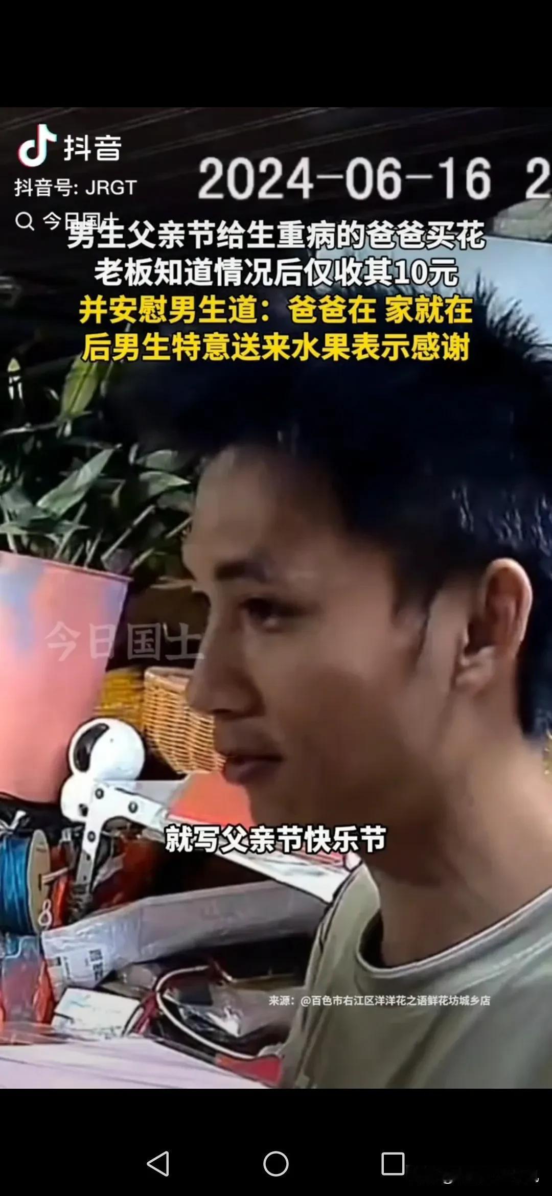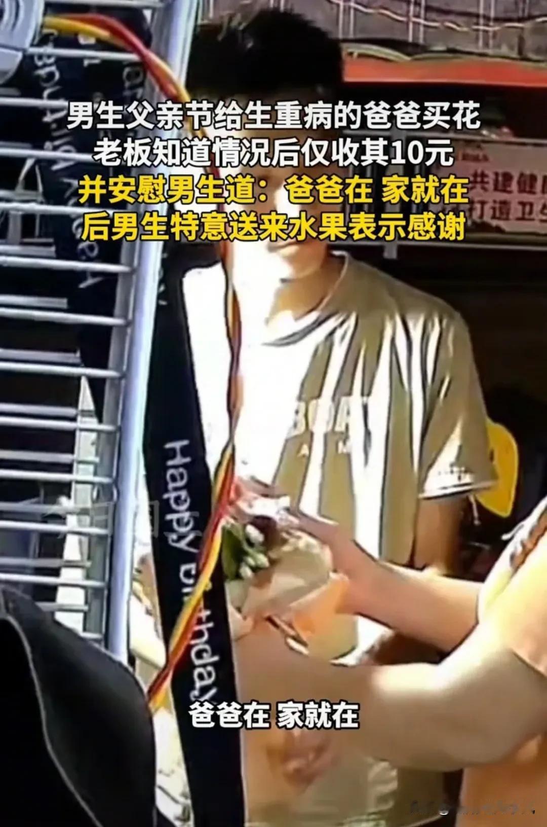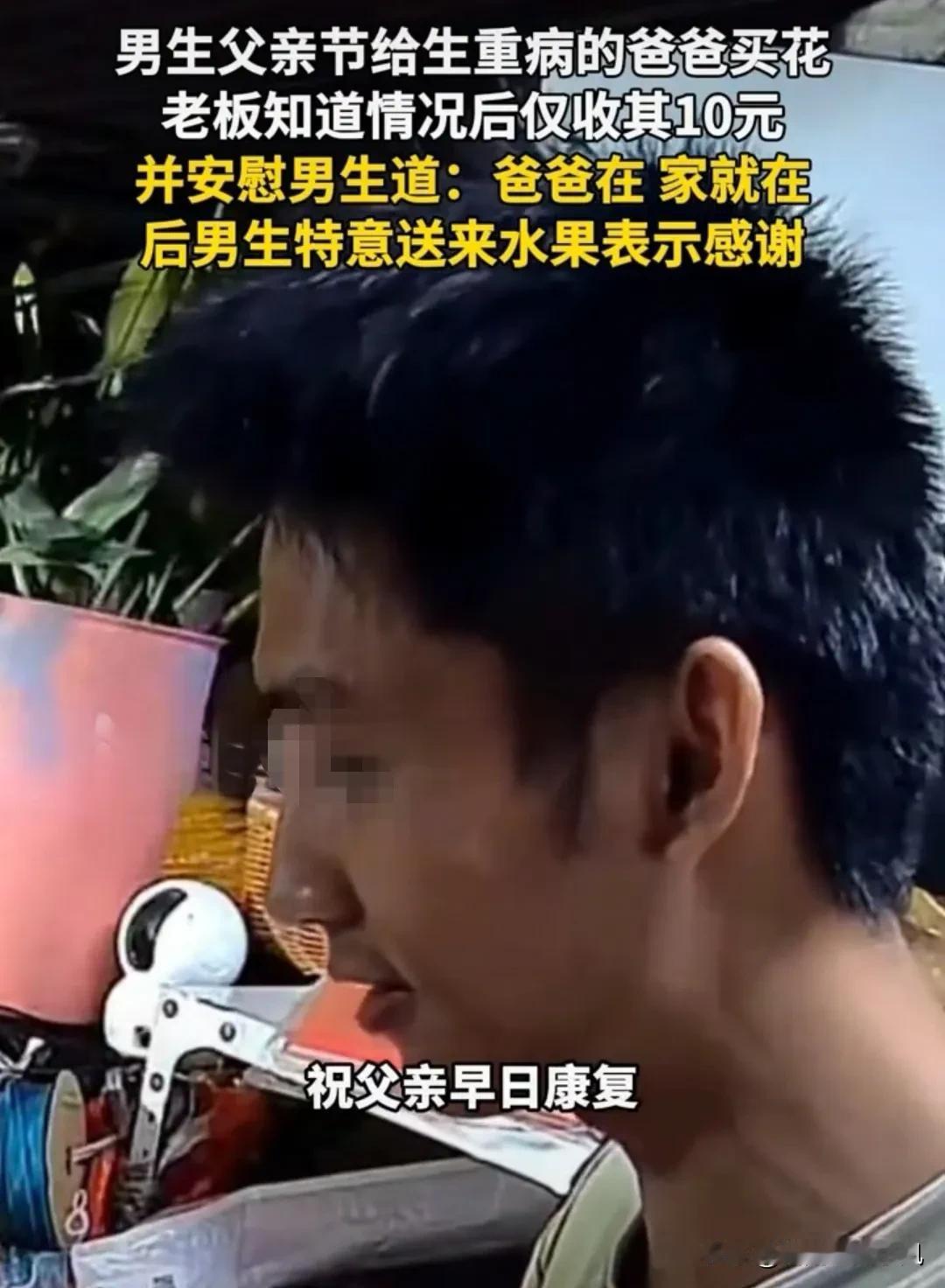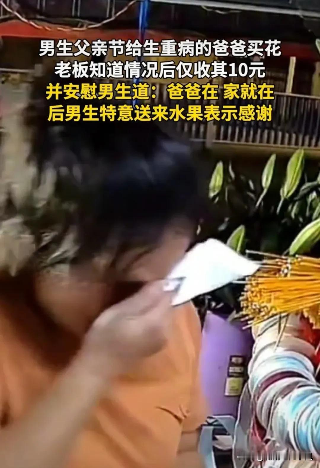 “看哭了!”广西百色,父亲节前夜,男孩买花送给肾衰竭重病的父亲,花店女老板心疼不已,暖心打折卖给他!男孩深夜返回感谢,手里还提了两袋水果!网友彻底泪崩了:广西人太暖了! 女子是开花店的,她的花店就开在医院附近,父亲节前晚,花店走进一位男孩! 他看起来不大,估计也就16岁左右的样子,他先是问女子“老板,一束大的花是多少钱?” 女子回答“这束花要100块哦!” 男孩:“我没那么多钱,有没有便宜点的!” 女子就说“那就装一束小点的给你吧!30块钱你看怎么样?” 男孩点了点头! 就在女老板弄好花以后她又问“你买花是送给谁呀?” 男孩说“送给我爸爸!” 女子觉得很震惊“送给爸爸啊?真有孝心,还知道送花给爸爸!那阿姨帮你写个卡片吧!” 男孩说“那就写,爸爸父亲节快乐!祝你早日康复!” 女子一愣问他“爸爸生病了?现在住院吗?” 男孩回答“嗯嗯,爸爸就在附近住院,他肾衰竭,病的有的严重!” 女子有点伤感!她跟男孩说“那你不用给那么多钱给我了!我送点给爸爸!你给我10块钱就好了!” 装好花以后,女子把花递给男孩“祝你爸爸早日康复!” 她突然感慨的说“爸爸在,家就在!” 男孩拿着花走了以后,女老板突然控制不住自己了,也许是想到了自己的亲人,她一边流泪,一边干活! 最后,她实在绷不住,索性蹲在地上大哭了起来! 她哭的忘乎所以,过了快一个多小时,没曾想到,已经离开的男孩突然又返回来! 男孩手里提着两袋水果,恰好看到女子蹲在地上哭,他对着女子深深的鞠了一个躬!然后说道“谢谢你阿姨,这是我的一点心意!” 看到这里,网友破防了,怎么会有这么懂事的孩子啊! 这件事引发了网友的热议! 很多网友说,看哭了,眼泪一直止不住,听到男孩说父亲重病的时候已经很难受了! 看到女老板打折送花又更感动,最后听到女老板说“爸爸在,家就在!”已经绷不住了! 万万没想到,更令人感动的是男孩居然去而复返,还带回水果感谢她! 真的彻底泪流不止了!太感动了! [个人感受] 这个世界破破烂烂,总有人在缝缝补补! 女老板的暖心,换来了男孩的真心,孝顺懂事的孩子遇到善良有爱的老板,双向奔赴真的让人热泪盈眶! 赠人玫愧,手有余香! 原来中国人浪漫起来,才最懂中国人!