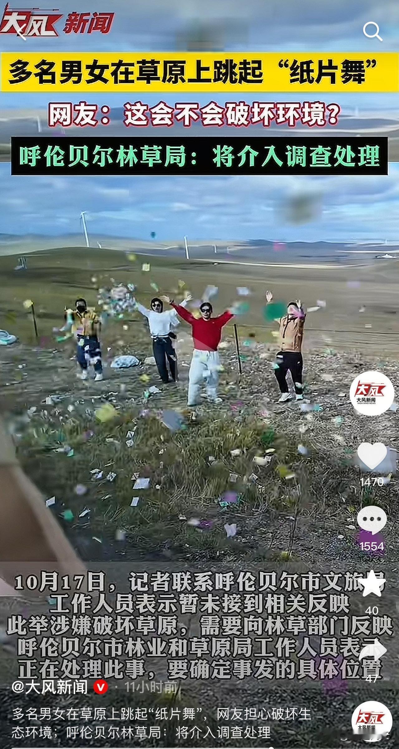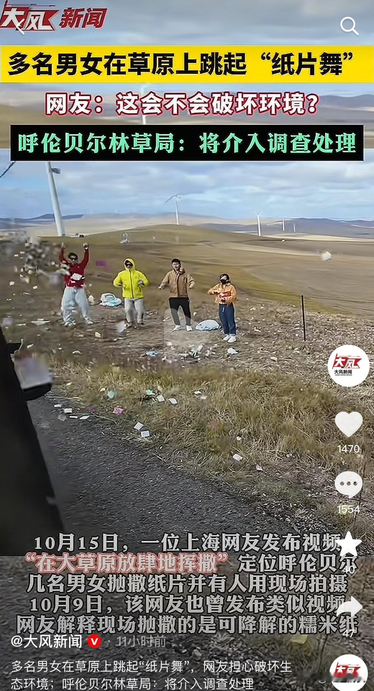 这一幕太刺眼!近日,有上海的网友发视频称,在呼伦贝尔大草原上有几名男女站在一排,肆意的抛洒纸片,然后去跳舞,前边还有人拿着手机拍摄。 视频里他们显得非常高兴,手舞足蹈,甚至高呼“就让吹吧,再往这边一点,我的老天爷”,旁边还有几袋未打开包装的纸片,而在他们的前面,就是满地的纸片。 有网友称,往大草原上撒纸钱是在破坏环境。 他们解释撒的是糯米纸,属于可降解的。 四川网友反驳,降解需要时间,经过实验,能买到的隆达,泡在水里两三个月没有任何变化,降解不等于遇水就化,高海拔,少雨水,堆积多了,更难降解。堆积厚了就会板结。 也有不少网友认为,大家就是大惊小怪,要是纸也破坏环境,那其它东西也别用了。 我支持当地林业部门严查此事,因为大家到大草原欣赏美景,有人欣赏完后留下一地的垃圾,这就是在污染环境。 前段时间蔡国强烟花事件,引发广大的关注和吐槽,结果他们自己看到这些,不仅不长记性,仍然在大草原上肆意抛洒纸片,虽然他们解释说是糯米纸,但是它仍对当地产生一种污染,他们的行为跟蔡国强有什么区别? 他们这种行为传递出来的信息,却是非常糟糕的一种,这等于说是随地乱扔垃圾,如果大家都效仿此行为,那么大草原还会存在吗? 最后希望大家不管到哪里旅游,都要遵守一个原则:不要留下任何东西!爱护环境,人人有责!