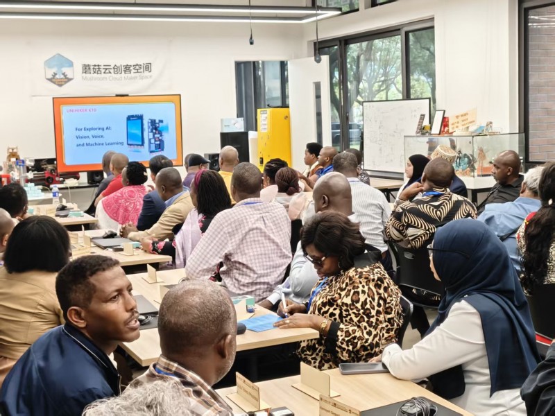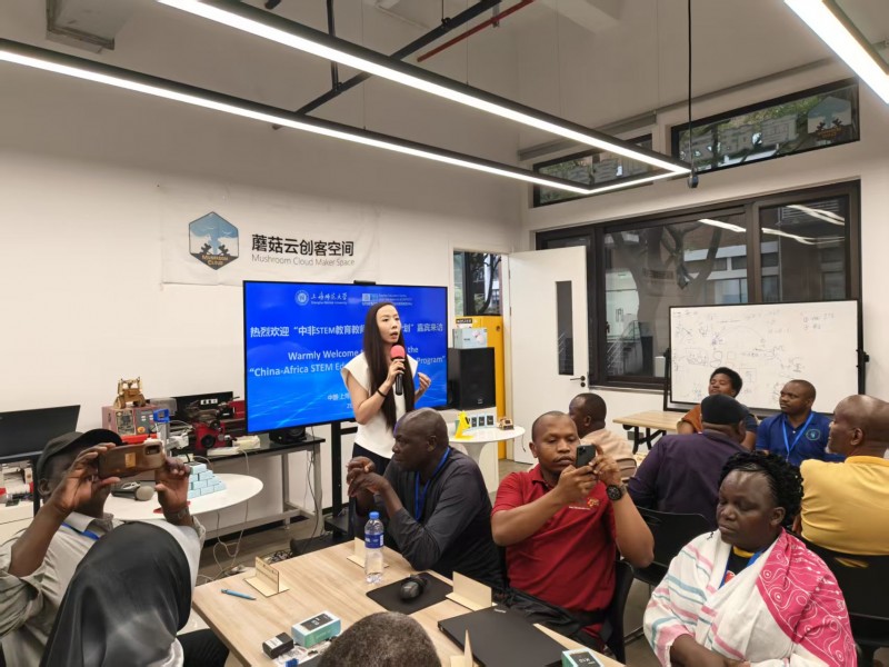 2025年10月17日下午,由教育部国际合作与交流司、教育部教师工作司、上海市教育委员会指导,联合国教科文组织教师教育中心、上海师范大学主办的“2025年中非STEM教育教师培训合作计划”专题培训之“AIEmpoweringSTEMTeacherEducation”在蘑菇云创客空间顺利开展。来自坦桑尼亚、加纳、南非、肯尼亚、埃塞俄比亚、乌干达、卢旺达、赞比亚、尼日利亚、马拉维、科特迪瓦的非洲11个国家近60位STEM领域的非洲国家教育官员、教师教育者、专家学者及中小学教师齐聚一堂,沉浸式解锁了以“行空板K10”为核心的AI教学实践新路径。