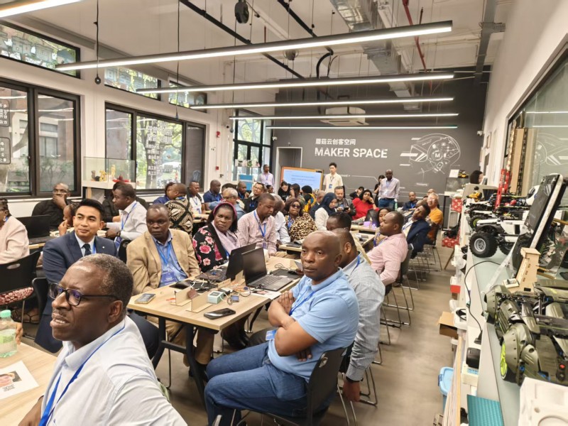 作为接待与技术支持方,上海智位机器人股份有限公司(DFRobot)旗下的蘑菇云创客空间,自2013年成立以来已获多项权威认证——科技部首批“国家级众创空间”、"上海市学生(青少年)科创教育基地","上海市青少年创新实验室","上海市中小学人工智能教育基地",此次凭借专业的教学场景与技术资源,为非洲学员打造了“从技术认知到实操落地”的全流程交流平台。