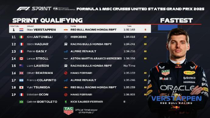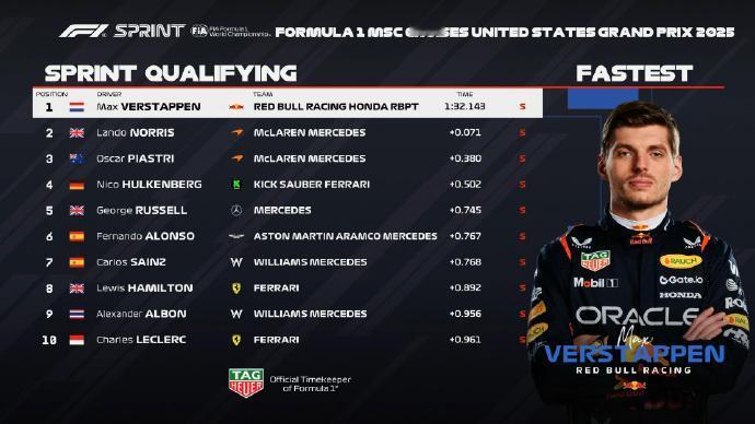赛车:2025F1美国大奖赛维斯塔潘夺冲刺赛杆位! 北京时间10月18日凌晨,2025F1美国大奖赛冲刺赛排位赛结束,维斯塔潘连续第三年拿下奥斯汀冲刺赛杆位。 诺里斯和皮亚斯特里分列二三位。霍肯伯格第四刷新车队最佳冲刺赛排位成绩,拉塞尔第五,阿隆索第六。两辆威廉姆斯排在第七和第九,两辆法拉利排在第八和第十。 冲刺赛将在10月19日周日凌晨1:00开始!