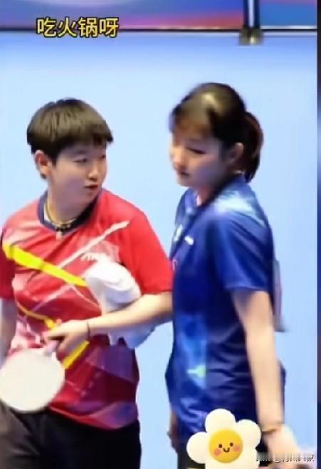 哈哈!孙颖莎从小就会哄女孩开心! 打赢李亚可后, 看人家不理自己, 赶忙凑过去问: 今晚吃什么? 火锅还是卤煮? 上次指点深大队打赢了佳佳, 莎莎也是买了两支冰糕才哄好的! 这次亚锦赛, 大藤本来还一脸怨气, 莎莎一束花, 接着让大藤眉开眼笑。 莎莎太会哄女孩开心了!