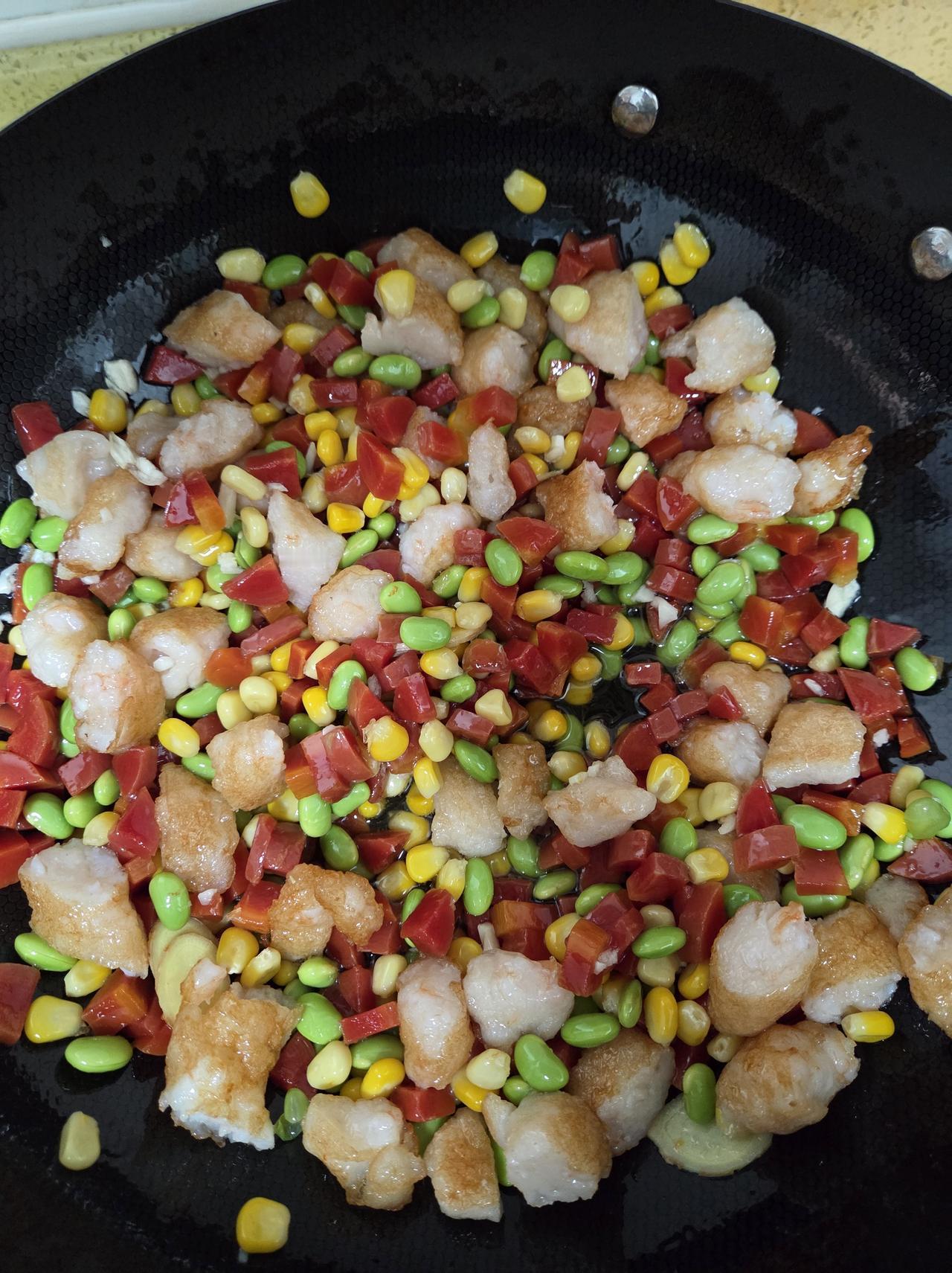 这炒饭味道如何? 实在不知道吃什么,便做了份大杂烩炒饭。 先把胡萝卜丁、毛豆和玉米煮熟,接着将虾滑炒成块状,随后把这些食材与米饭混合在一起,加点盐、酱油和芝麻油,就可以出锅啦。 这炒饭香气扑鼻,味道好极了!吃了一碗,还想再来一碗,真是意犹未尽。 美中不足的是,这虾滑是买的,不太健康。没办法,自己又不会做。 炒饭