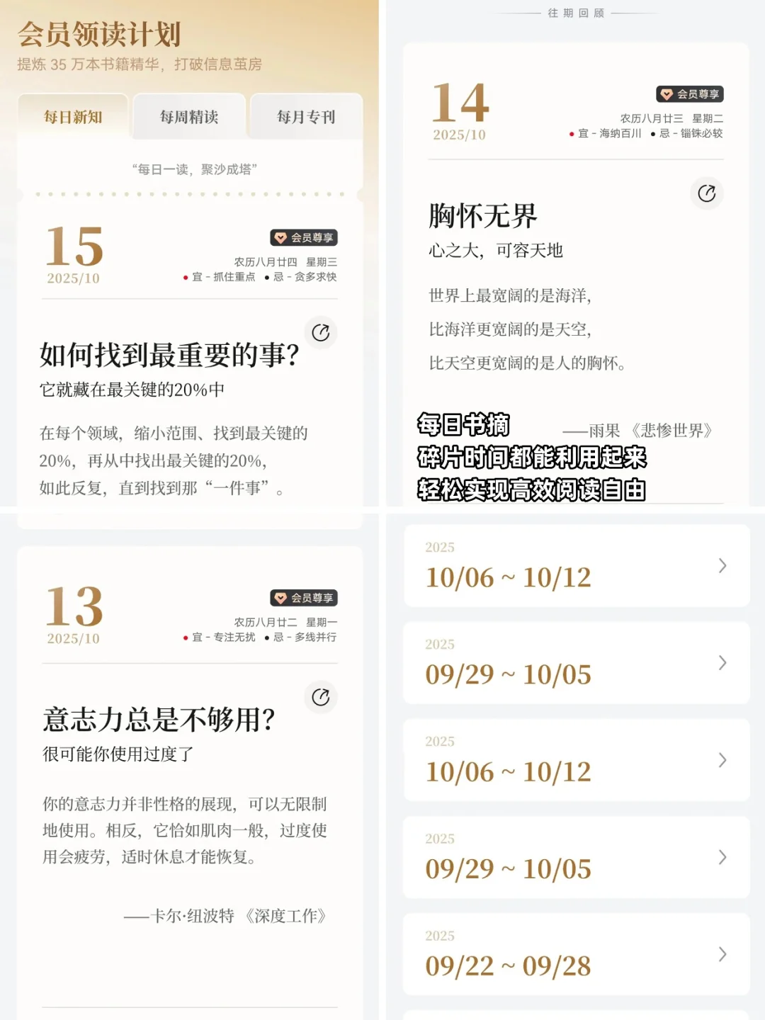 ✅碎片化高效阅读神器:会员领读计划太贴心!每日书摘、每周好书、每月月刊,通勤、摸鱼的碎片时间都能利用起来,轻松实现高效阅读自由~