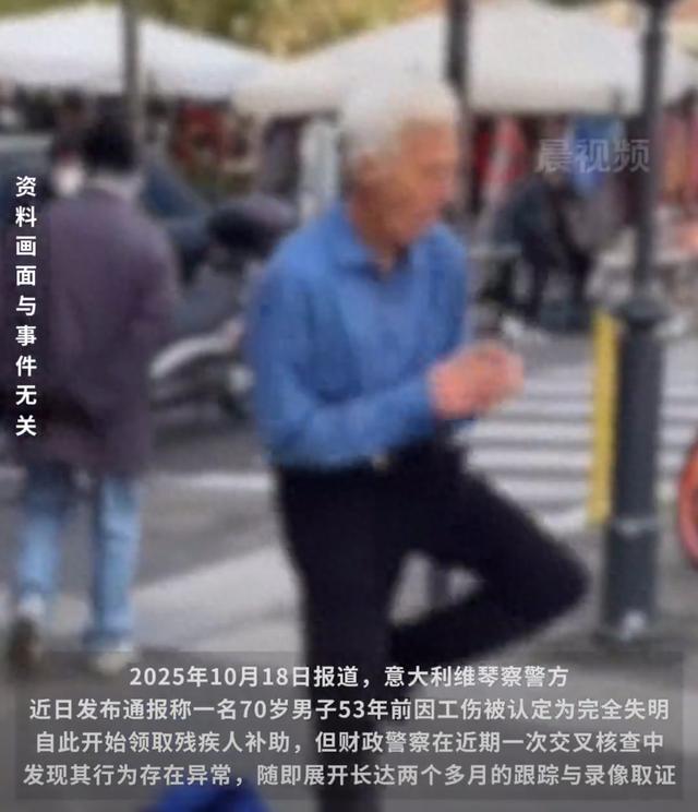 意大利维琴察警方通报,该男子53年前因一起工伤事故被认定为完全失明,自此开始领取残疾人补助。然而,财政警察在近期一次交叉核查中发现其行为存在异常,随即展开长达两个多月的跟踪与录像取证。