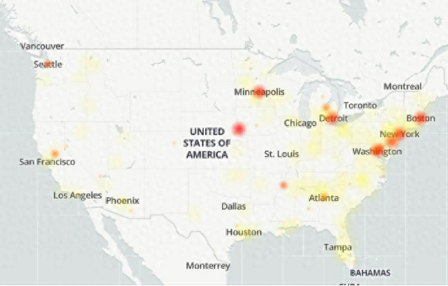Downdetector绘制的地图显示,全美各地均出现故障报告,其中纽约市、波士顿、华盛顿特区、底特律和明尼阿波利斯尤为集中。亚特兰大、休斯顿、旧金山、菲尼克斯和西雅图等地的用户也受到影响。
