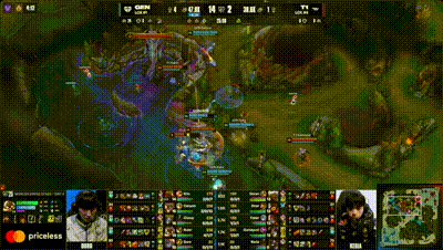 虎扑10月18日讯GEN对阵T1,Oner猴子进场被Duro波比锤飞,GEN大龙团1换4大胜领先一万