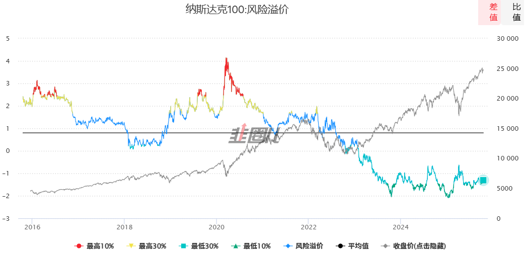 从近10年来看,纳斯达克100指数FED百分位处于历史低位。目前,并不是一个合适的介入时点。