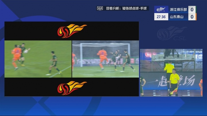 没给泰山队点球!裁判亲自回看VAR,没有判浙江球员手球犯规