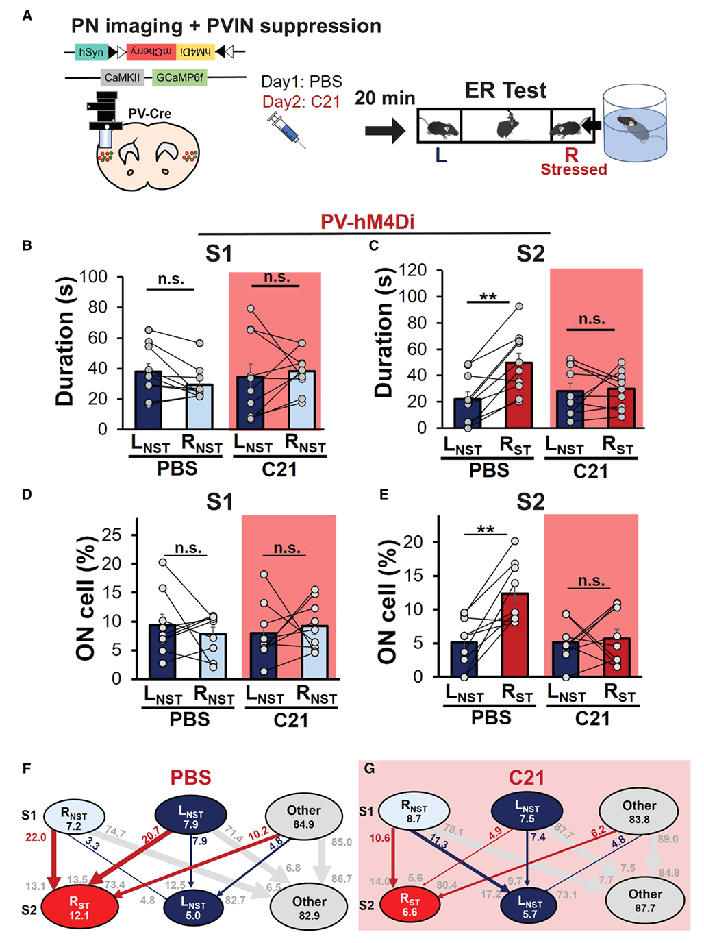 图3:抑制小白蛋白中间神经元(PVINs)抑制对受应激(ST)同伴的互动增加及锥体细胞表征
