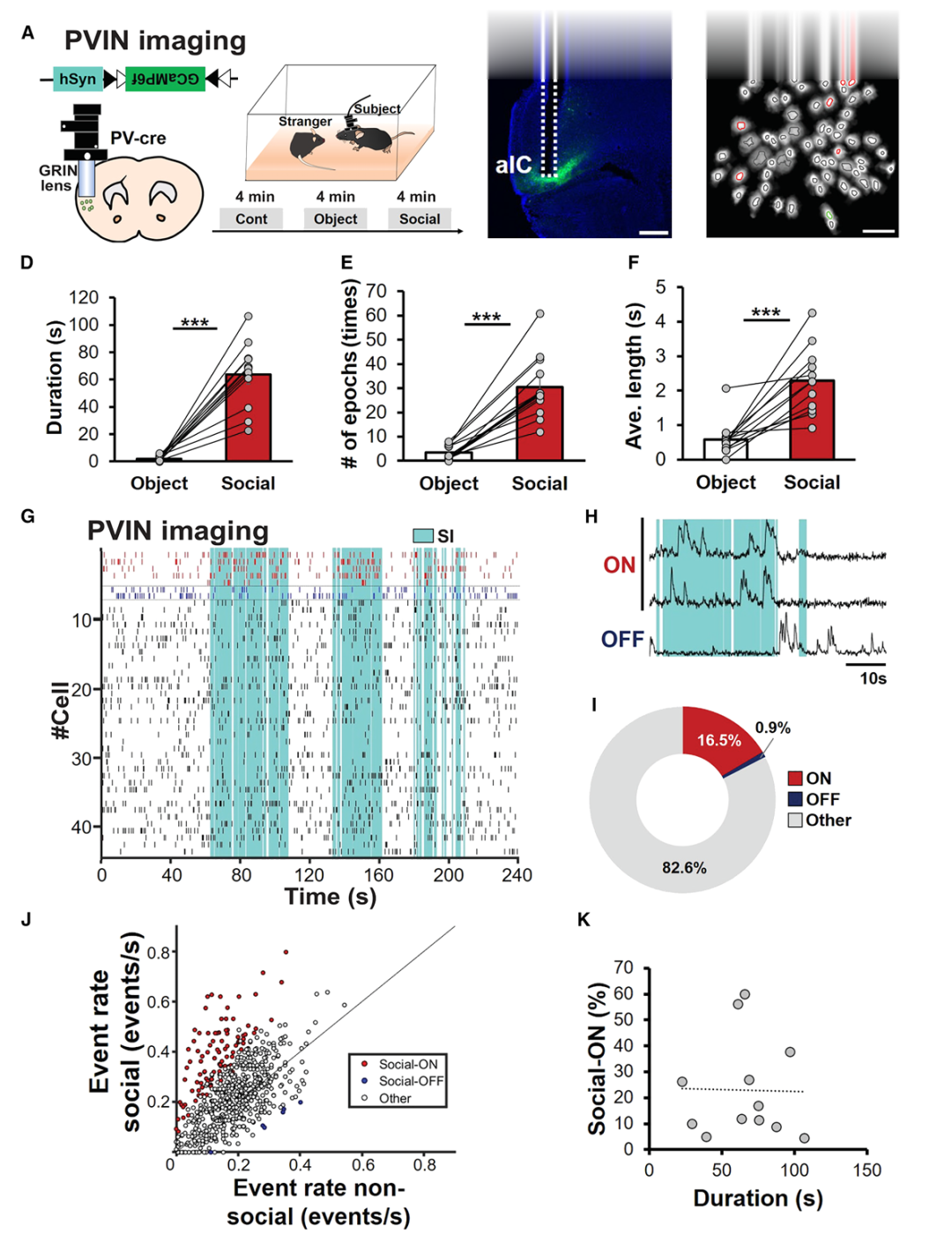 图1:岛叶无颗粒区(aIC)小白蛋白中间神经元(PVINs)中Social-ON与Social-OFF细胞的活性特征