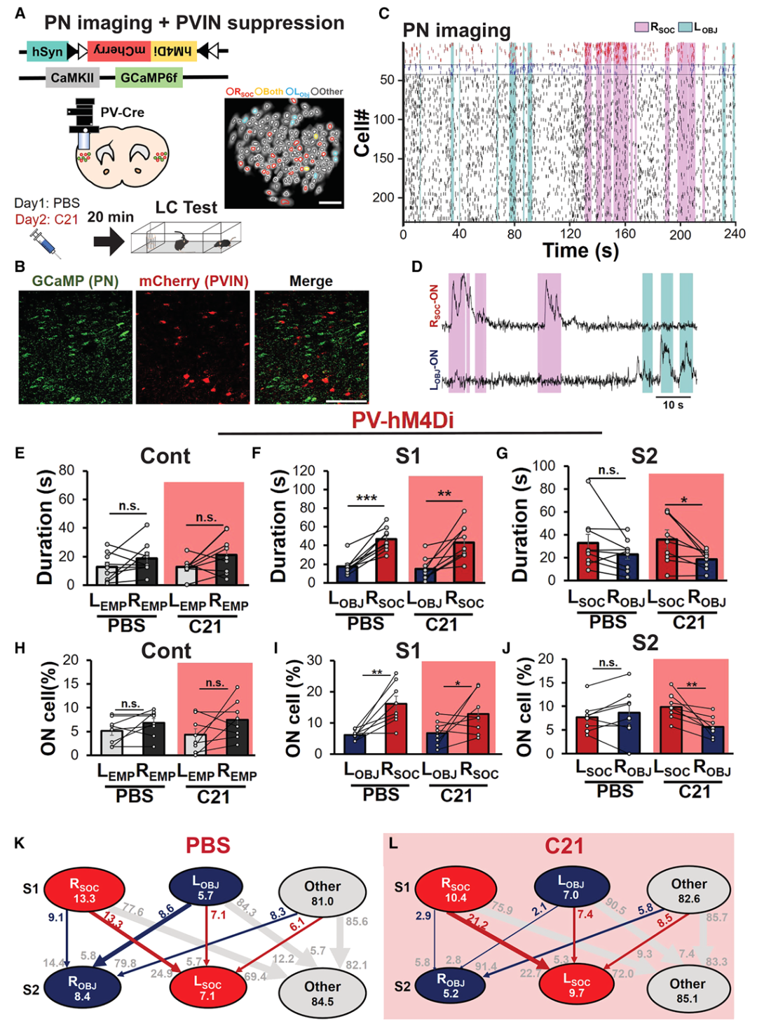 为验证PVINs的功能意义,研究通过化学遗传学抑制aIC的PVINs。结果发现,抑制后小鼠在LC测试中无法失去对熟悉同类的偏好,即难以建立社交熟悉度;同时,锥体细胞(PNs)的社交目标特异性转换异常——原本向非社交刺激倾斜的转换被打破,C21处理组中Rsoc-ON细胞向Lsoc-ON转换的比例(21.2%)远高于向ROBJ-ON转换(2.9%),社交与非社交转换比达7.31(对照组仅1.23-2.22),提示PVINs通过调控PNs的目标偏好重组,控制社交熟悉度形成。