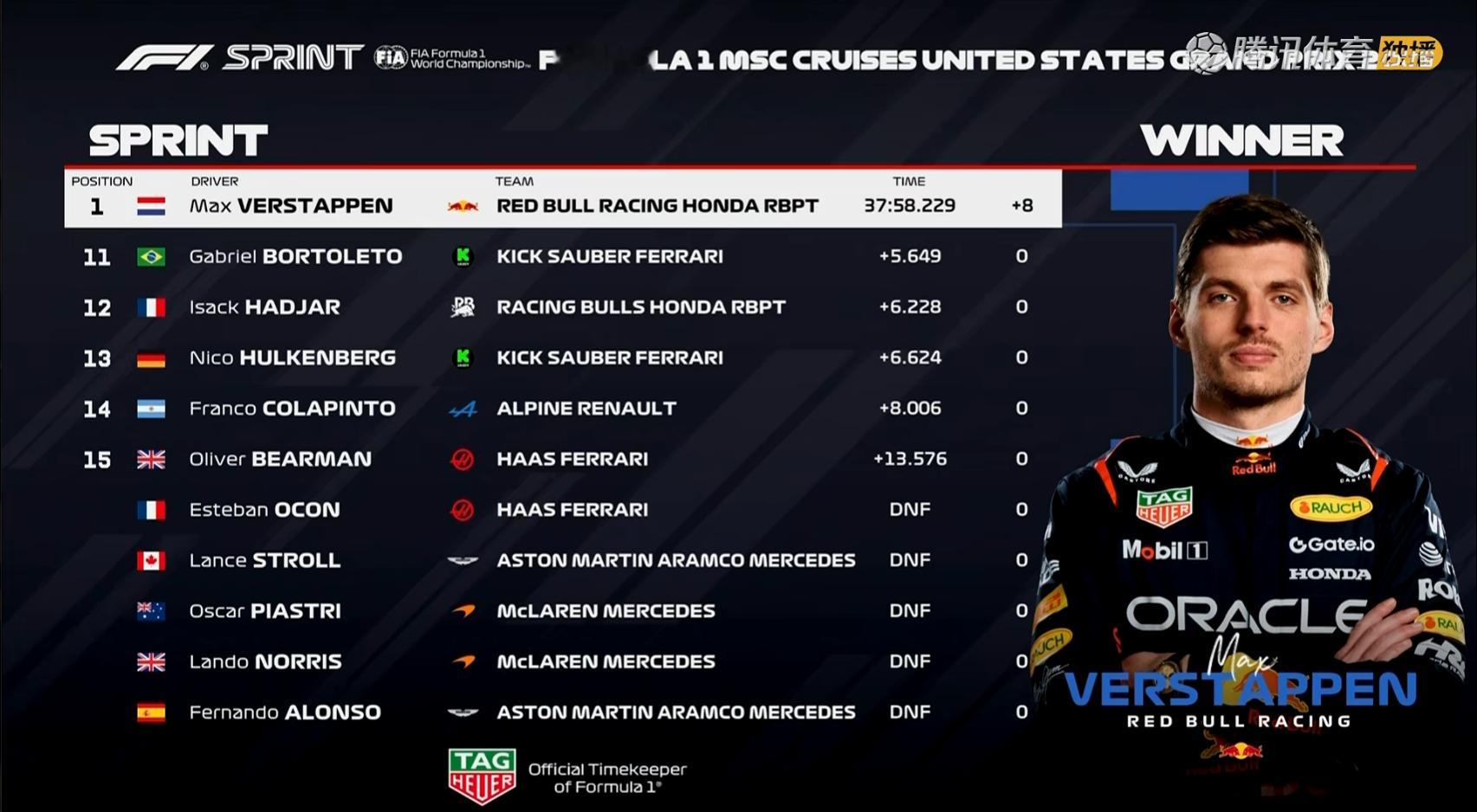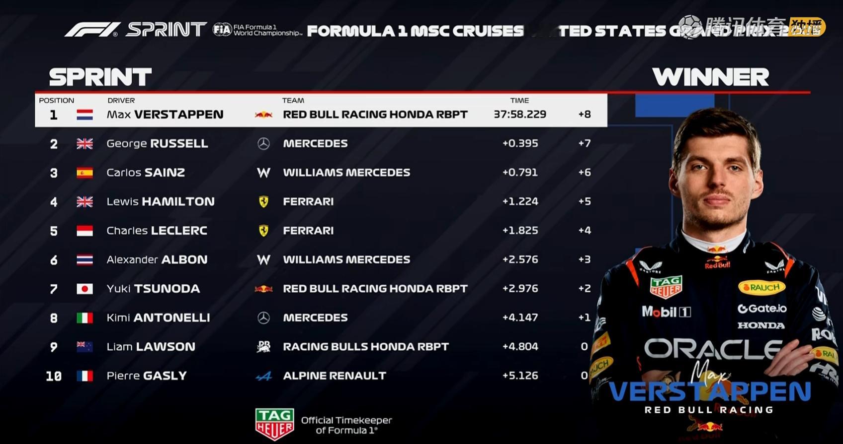 F1美国站冲刺赛成绩表如图,北京时间5点排位赛!F12025F1美国大奖赛