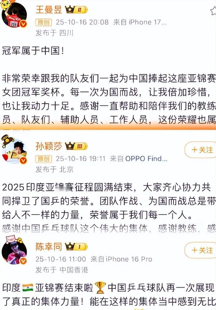 国乒夺冠后连夜逃回国内,王皓老婆一句话笑疯全网 真没想到,一场乒乓球赛硬是打出了野外生存的感觉。2025年10月15日,亚锦赛在印度收尾,中国队把男女团冠军全都拿下,算是彻底洗刷了去年只拿两金的耻辱。可夺冠当晚,队员们连庆功饭都没吃,收拾行李拔腿就走,IP地址转头都变回国内了。你说这是夺冠庆祝?更像是集体越狱成功。 印度那比赛场地,说是临时搭的都算抬举。外面艳阳高照,气温冲到34℃,场馆里没空调,连墙都没刷完,工人在边上叮叮当当敲着,运动员在场上打得汗流浃背,头顶全顶着冰袋,活像在蒸桑拿时强行打球。王曼昱练球时差点被鸟屎精准命中,梁靖崑热身时脚边蹲着只青蛙,你看看我,我看看你,谁都不动,场面一度沉默。这哪是国际赛事,说是丛林探险都不为过。 更离谱的是比赛正打着,天上忽然飞来一架无人机,在选手眼前来回晃悠。林诗栋正发球呢,眼皮一跳,一个黑影从脸前掠过——他自己都愣了,台下观众还以为是特效。解说员后来说:“我当时以为我眼花了。”谁能想到,国际赛场还得防无人机偷拍? 吃喝更是不敢想。没人敢碰当地食物,刘冠凯直接晒出房间照片:地上堆满泡面箱子,矿泉水成箱垒墙。自热锅成了硬通货,饿了就自己煮一口,吃得满脸悲壮。赛后回了国,第一顿食堂的鸡蛋炒西红柿,大伙儿吃出了满汉全席的感觉。 最熬人的还在后头。决赛赢了,大家站台下等颁奖,结果现场乐队突然开始演出,整整40分钟印度神曲循环播放,选手站得腿发软,脚都麻了。终于轮到颁奖,主持人话筒三次断电,现场一阵手忙脚乱。拿到花束那一刻,林诗栋下意识闻了下,脸立刻皱成一团,转头就对周启豪说:“这什么味儿?快熏晕了!”两人互相递花臭对方,台下看得想笑又不敢笑。那花味道实在惊人,连外国选手都悄悄把花放远点。吉祥物更是设计得像恐怖片道具,谁拿在手里都像在拍灵异照。 王皓倒是全程笑呵呵,教练该稳得住就得撑住场子。可梁靖崑赛后发条动态感谢团队,评论区炸了——他老婆小雅冒出来一句:“都瘦了,就皓哥一点没瘦。”这话直接冲上热搜,网友笑倒一片。想想也确实,天天喝矿泉水啃泡面,不瘦都难,王皓还能一脸福相,也是真有体质。 这趟印度之行,说是打球,其实是历劫。可刚落地,消息就出来:10天后主力们又得飞法国,打WTT。孙颖莎还被日本《桌球王国》杂志封了封面,万字长文研究她的发球,主编都承认,那旋转让日本队员心里发毛。国外盯着咱们盯得紧,哪敢松一口气?