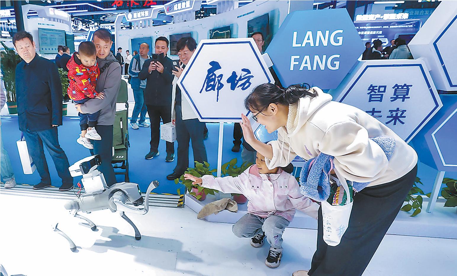 10月18日,2025中国国际数字经济博览会廊坊展区内,润泽科技有限公司展位上的机器狗与小朋友互动。记者陈童摄