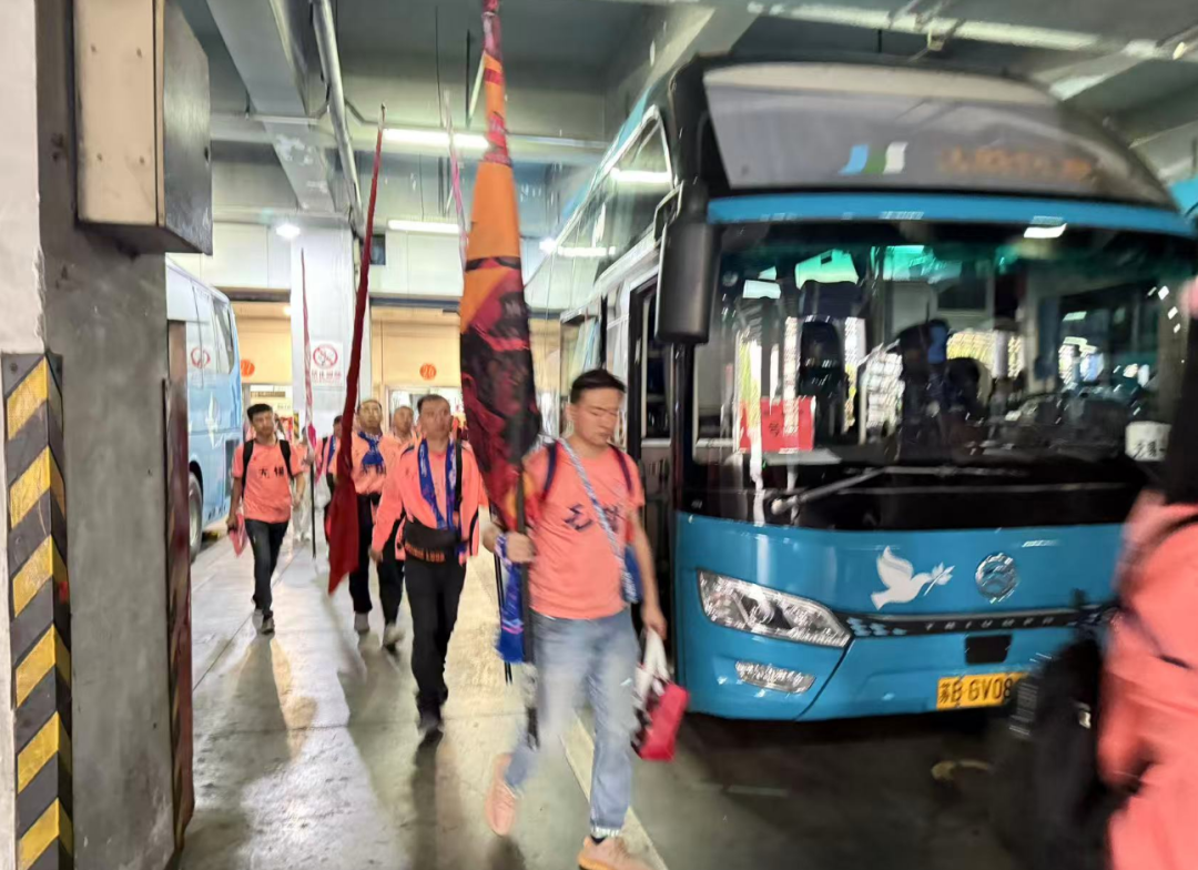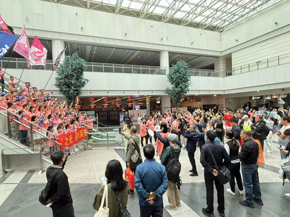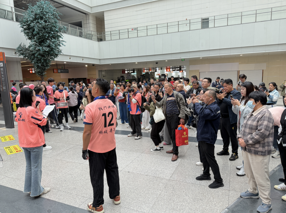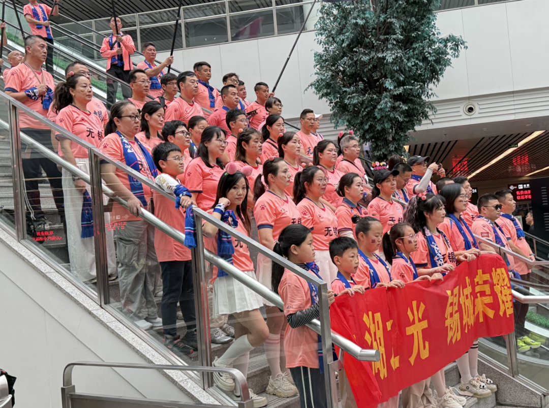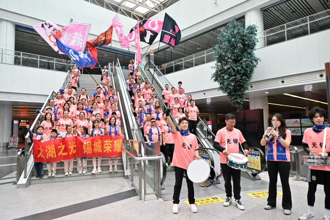 下午1时许,无锡汽车客运站内已人声鼎沸。“嘟嘟嘟……”一阵嘹亮的小号声响起,“锡城12人&锡城玫瑰”“苏超”无锡队助威团的小号手吹响出征冲锋号。成员们手举助威横幅,迅速排成整齐队列,齐声喊出铿锵有力的口号,一场出征仪式就此拉开序幕。