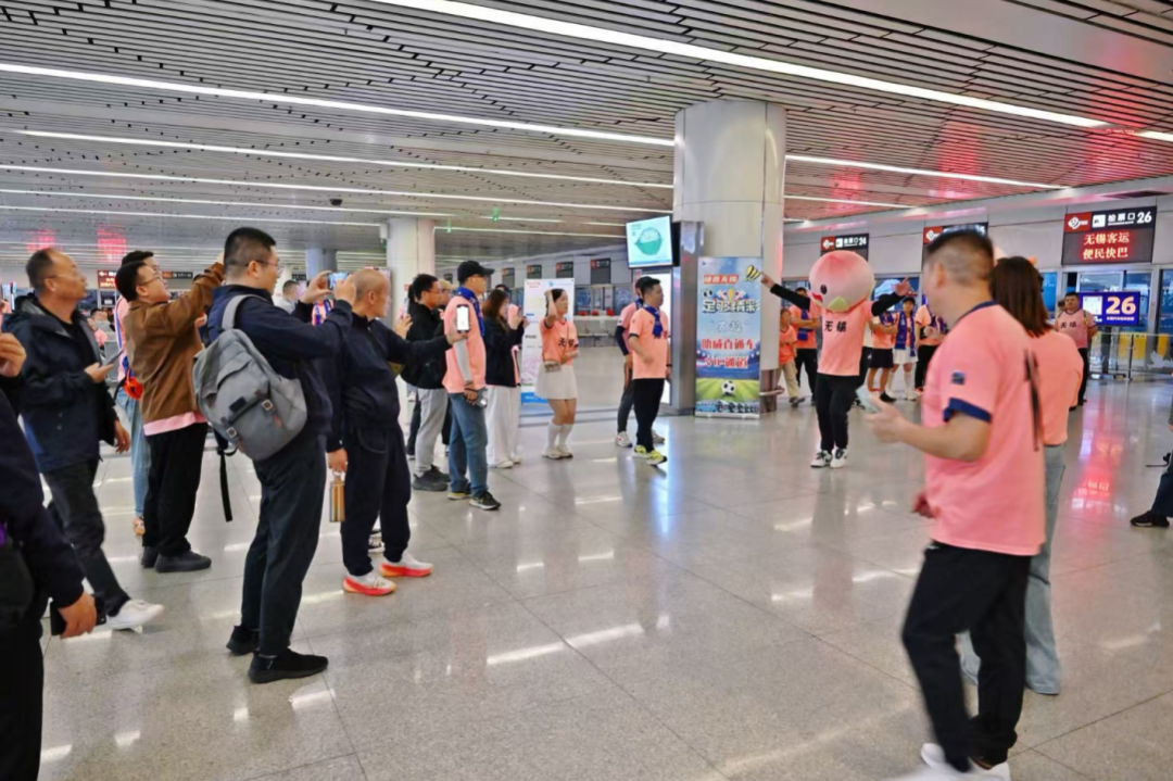 伴随着球迷们的欢呼声,首批赛事直通车缓缓驶出无锡汽车客运站。