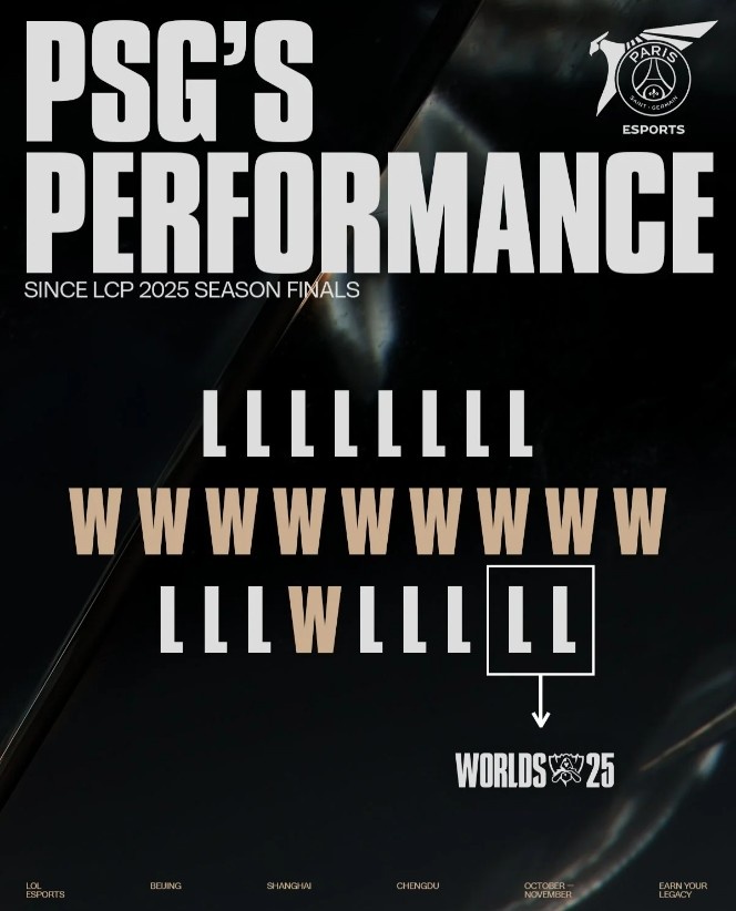 本赛季第三赛段,PSG遭遇小场八连败,随后取得小场八连胜挺进世界赛。