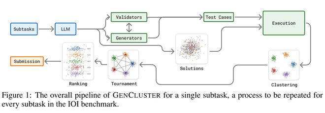 GenCluster对每个问题(精确到子任务级别)执行一套「海选+筛选+比拼+提交」的流水线流程: